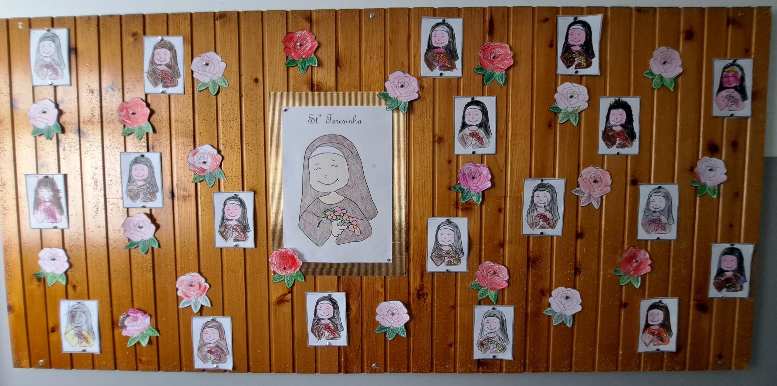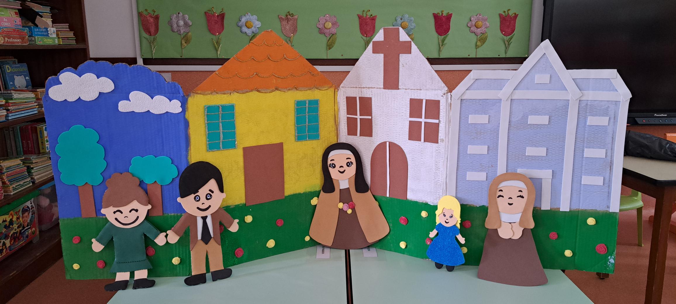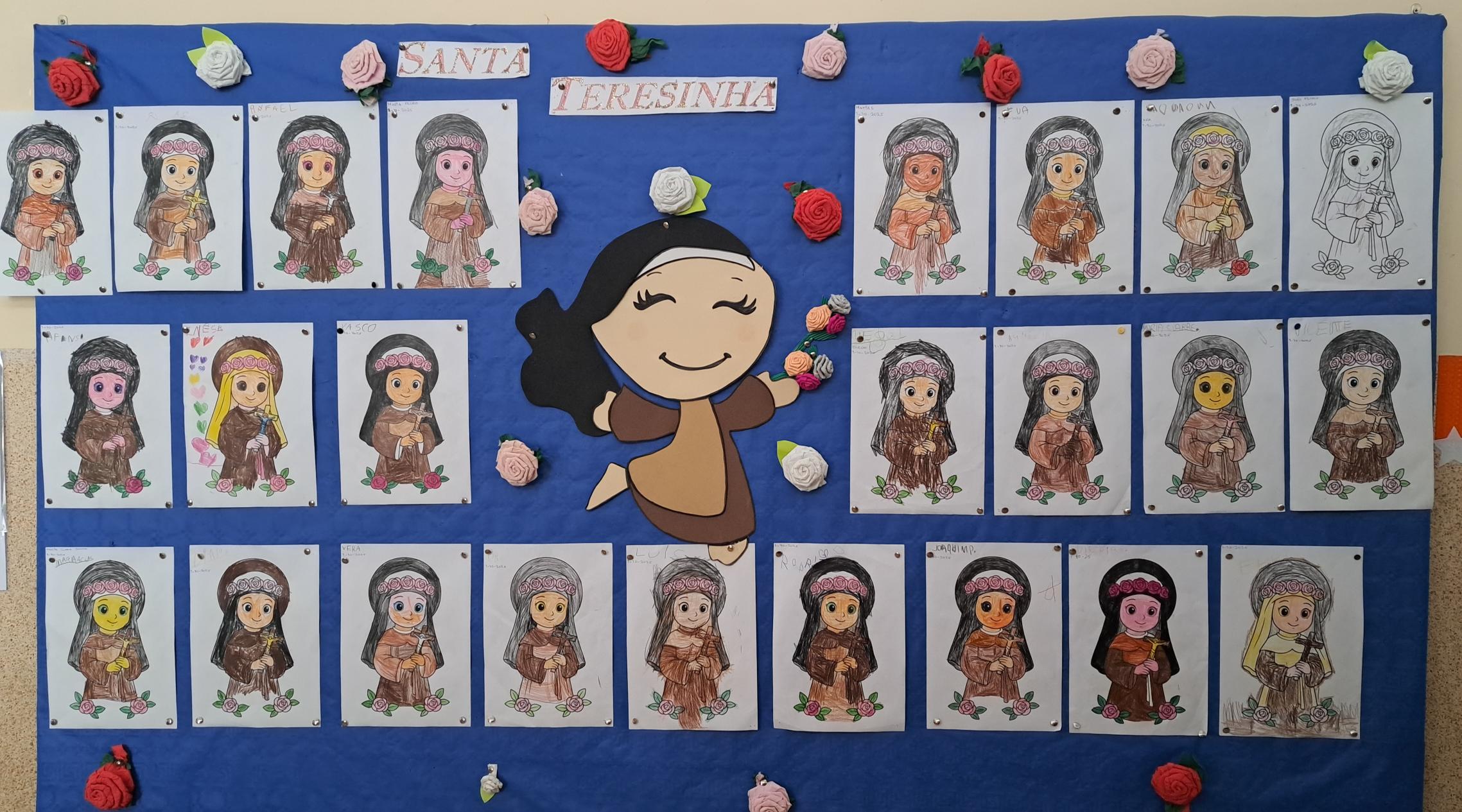 Também os alunos do pré-escolar homenagearam a Santa, realizando atividades diversificadas, tais como desenhos e pinturas sobre a vida da nossa padroeira. Aprenderam o refrão do “Hino de Santa teresinha” e assistiram a uma história, através da técnica dos fantoches, contada pelas educadoras.