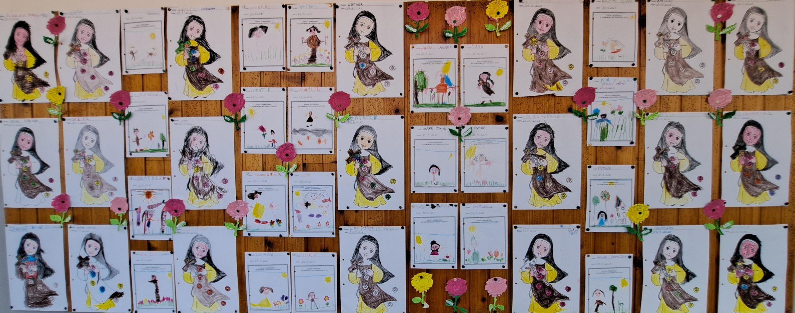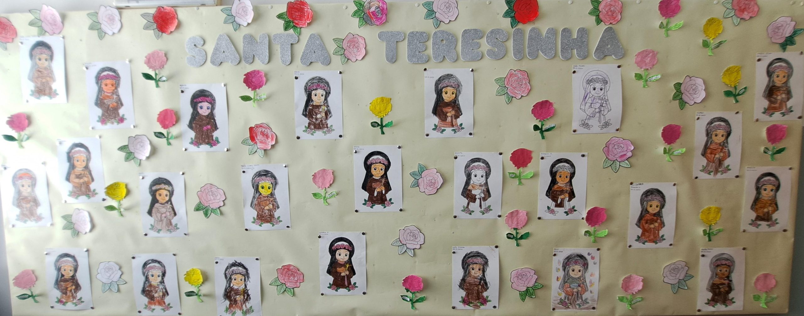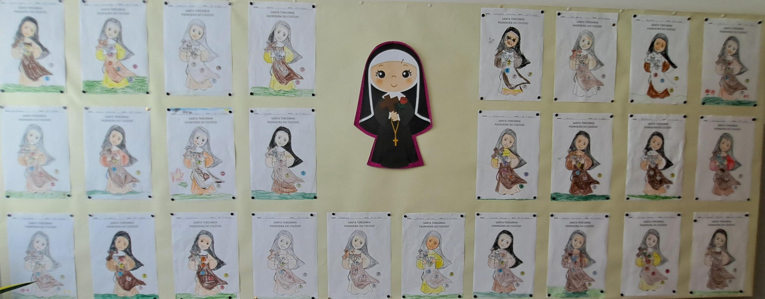 Também os alunos do pré-escolar homenagearam a Santa, realizando atividades diversificadas, tais como desenhos e pinturas sobre a vida da nossa padroeira. Aprenderam o refrão do “Hino de Santa teresinha” e assistiram a uma história, através da técnica dos fantoches, contada pelas educadoras.