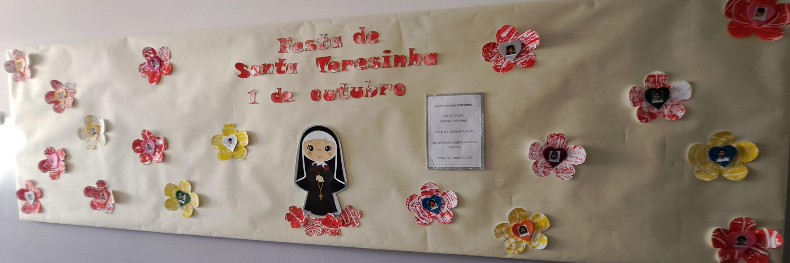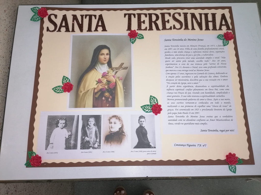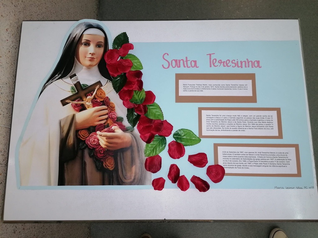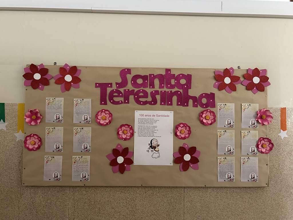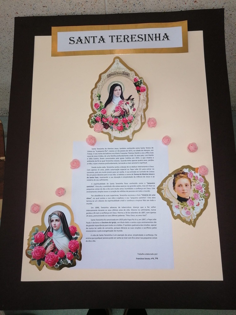 Foram então algumas as iniciativas para assinalar tão distinta efeméride. Houve duas eucaristias durante a manhã, no ginásio do colégio, dinamizadas pelo grupo Crescer na Fé, em que o Senhor Padre Dias sublinhou as virtudes de Santa Teresinha. É de destacar o andor com rosas em honra de Santa Teresinha ornamentado pelos alunos do terceiro ano, as ilustrações nos placares do 1.º ciclo, a exposição dos trabalhos de 7.º ano, orientados por EMRC, e as cartas compostas pelos alunos de nono ano, em que a emoção tomou a pena dos jovens finalistas, na aula de português.