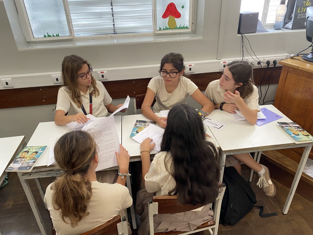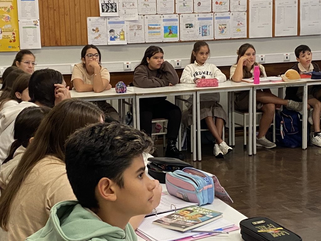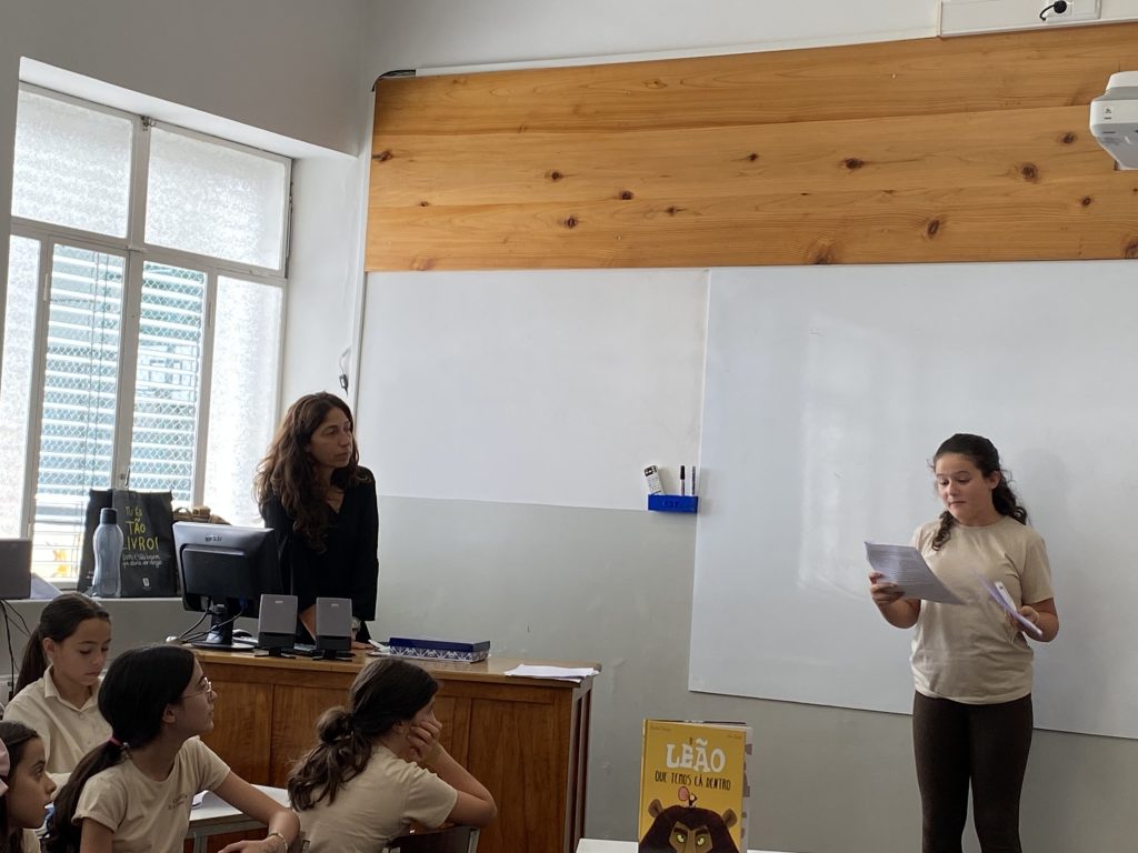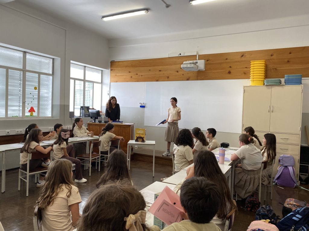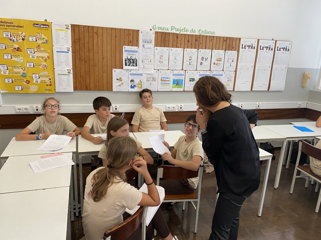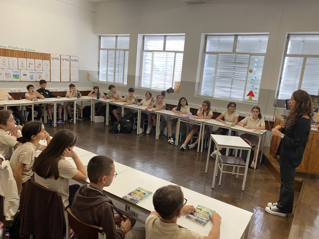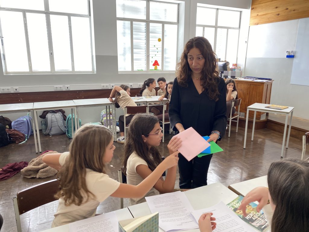 Dispostos em forma de “U” para facilitar a interação, os estudantes participaram numa sessão em que a autora não só falou sobre o livro como também estabeleceu comparações e ligações entre a história e a (sua) própria realidade, tornando a literatura mais próxima e relevante. Após as suas partilhas, uma música, uma carta, uma memória e um conto, a escritora propôs uma atividade prática para consolidar a compreensão do livro. Assim, organizou os alunos em pequenos grupos de trabalho, desafiando-os a criar analogias entre alguns capítulos do livro e situações ou realidades de um mundo que é de todos nós, promovendo, dessa forma, a discussão e o pensamento crítico sobre o texto.