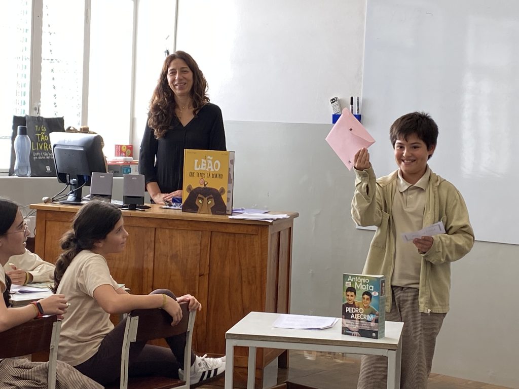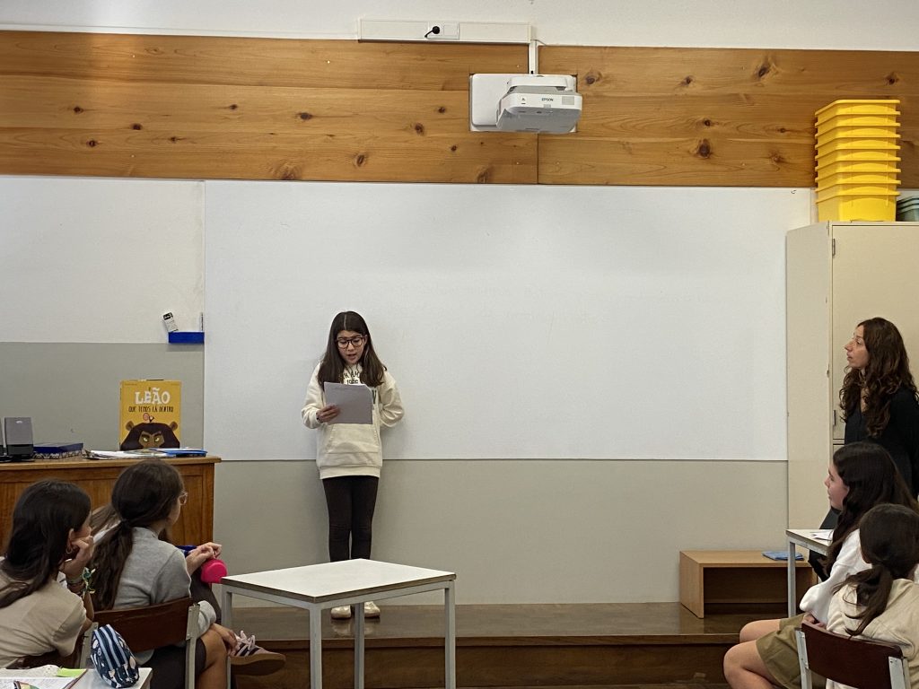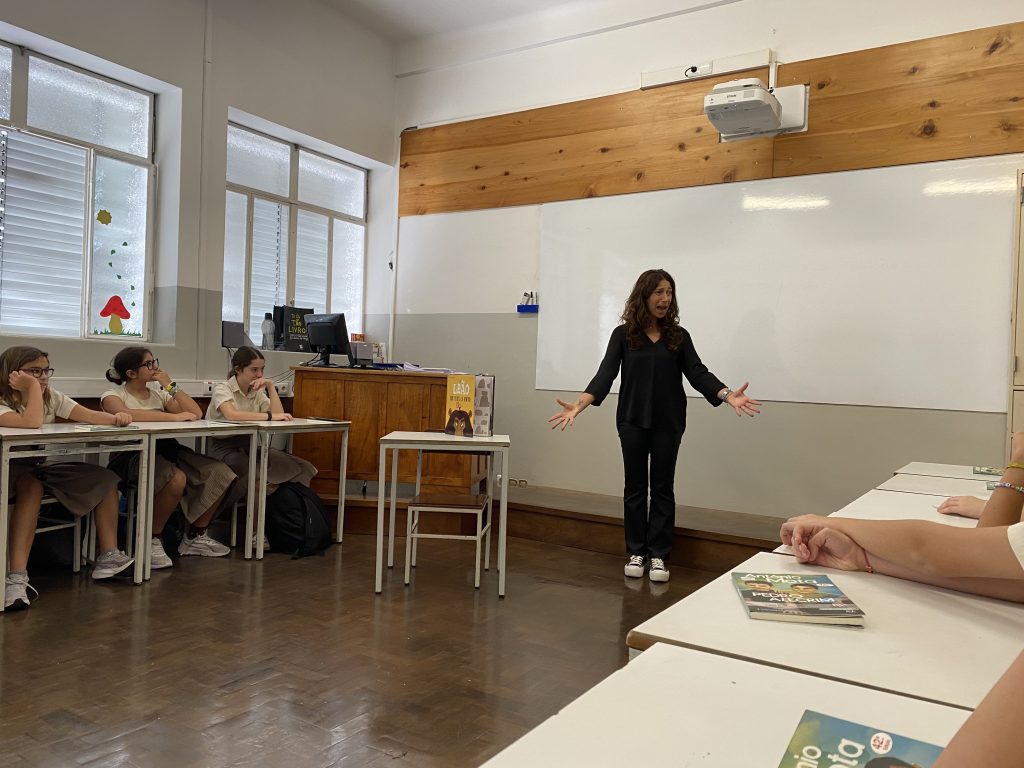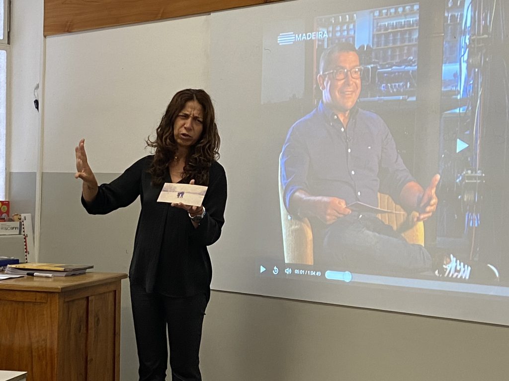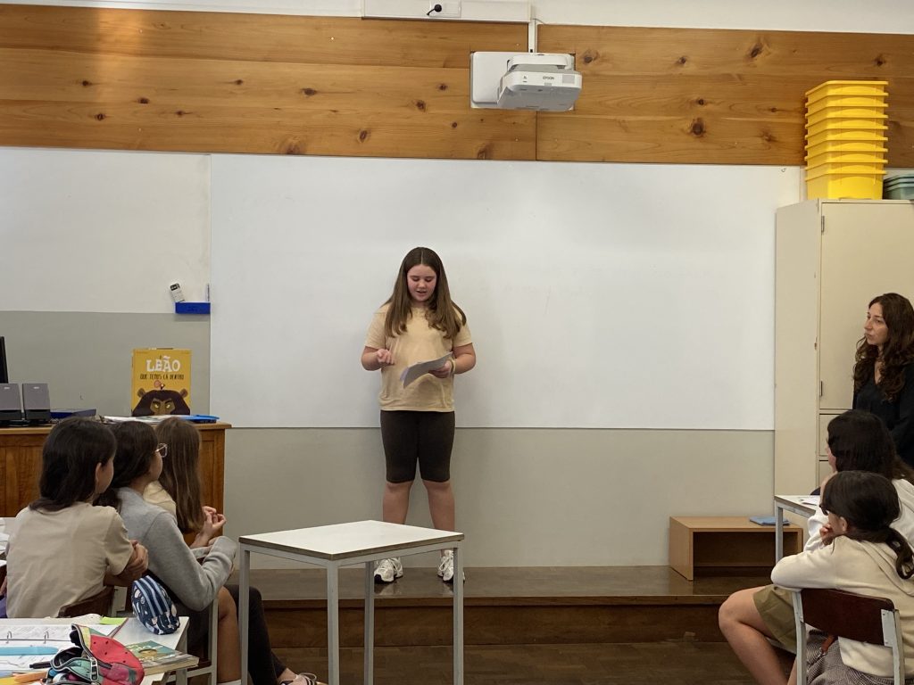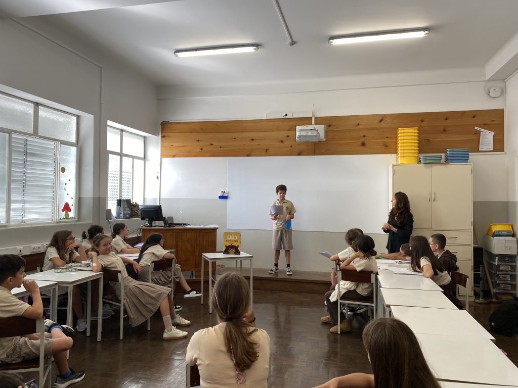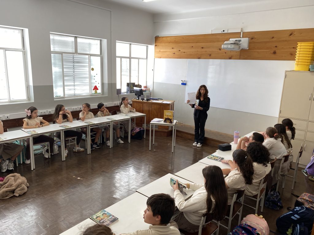 Dispostos em forma de “U” para facilitar a interação, os estudantes participaram numa sessão em que a autora não só falou sobre o livro como também estabeleceu comparações e ligações entre a história e a (sua) própria realidade, tornando a literatura mais próxima e relevante. Após as suas partilhas, uma música, uma carta, uma memória e um conto, a escritora propôs uma atividade prática para consolidar a compreensão do livro. Assim, organizou os alunos em pequenos grupos de trabalho, desafiando-os a criar analogias entre alguns capítulos do livro e situações ou realidades de um mundo que é de todos nós, promovendo, dessa forma, a discussão e o pensamento crítico sobre o texto.