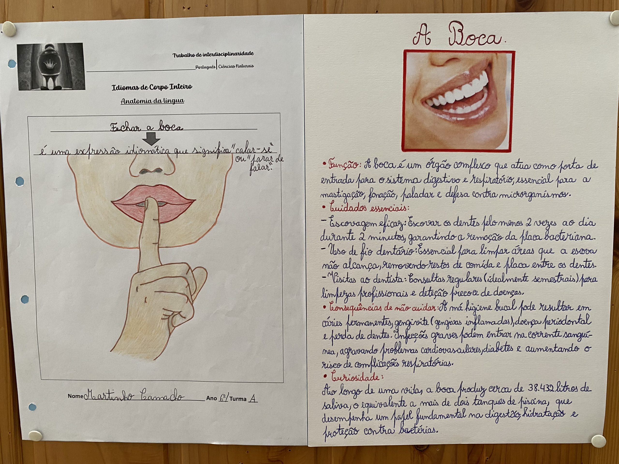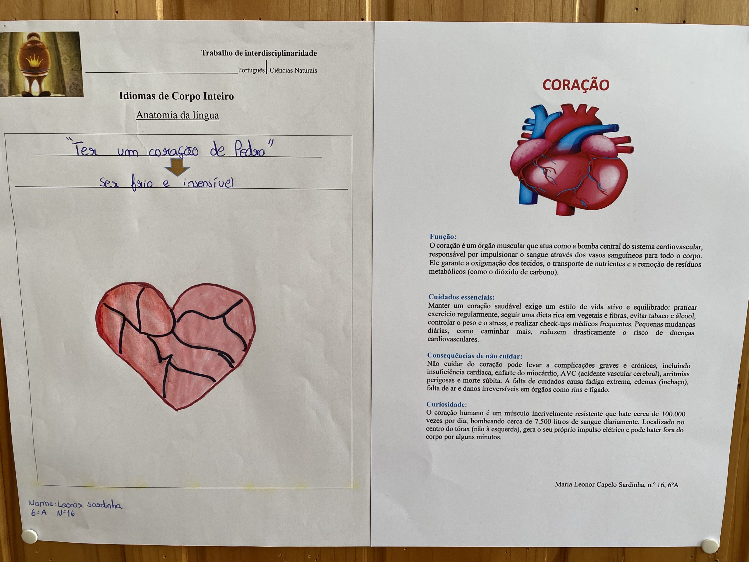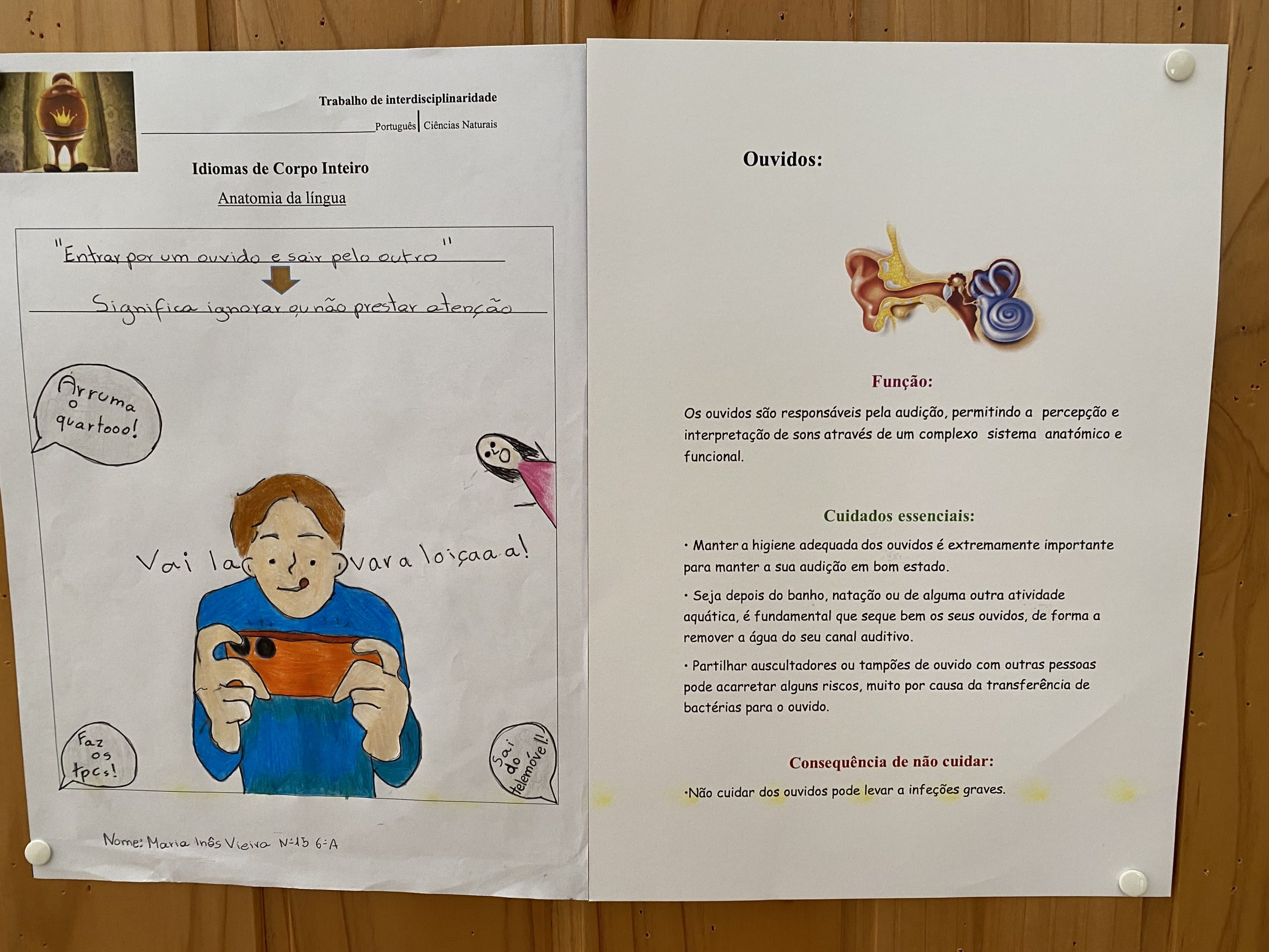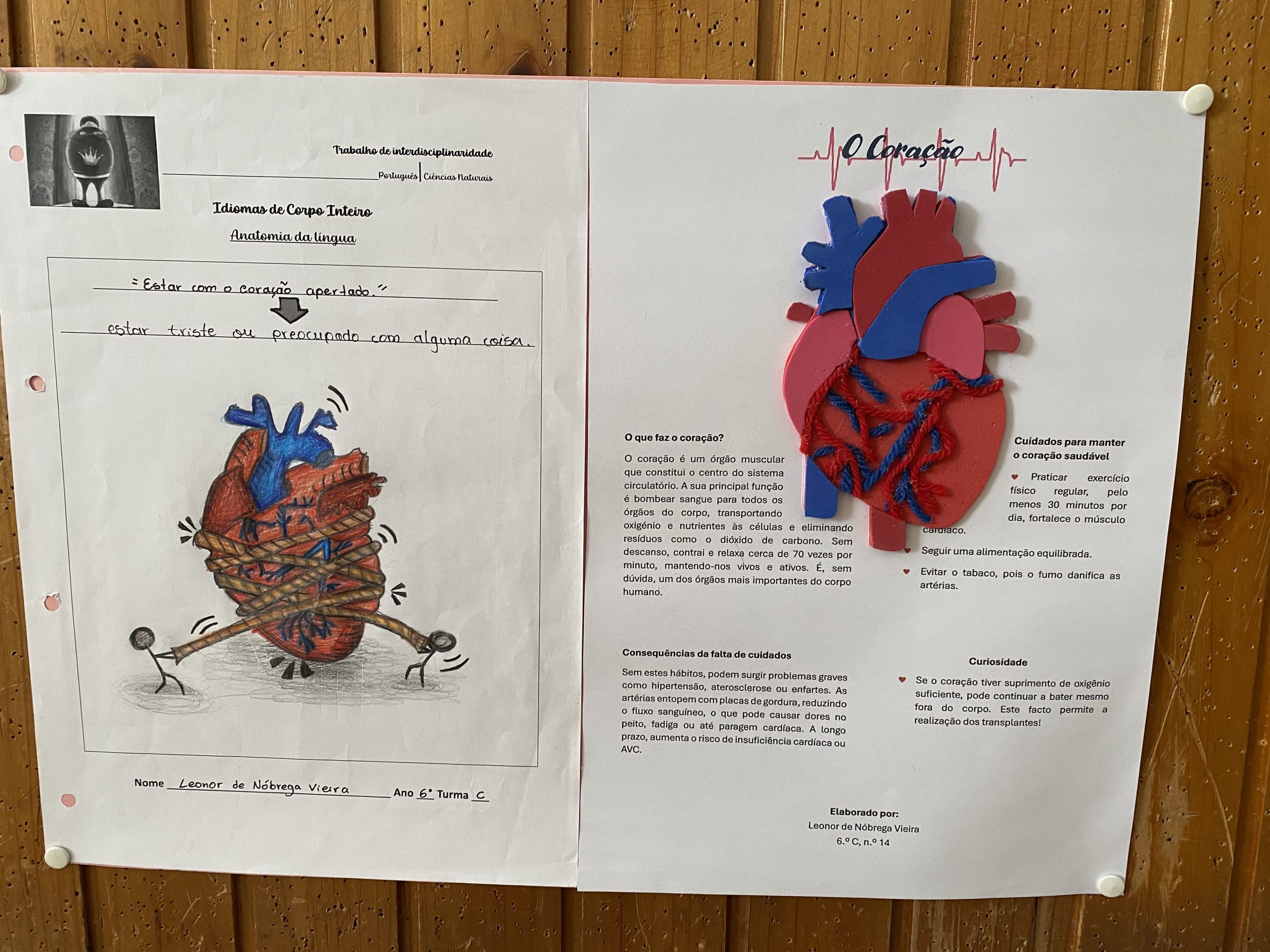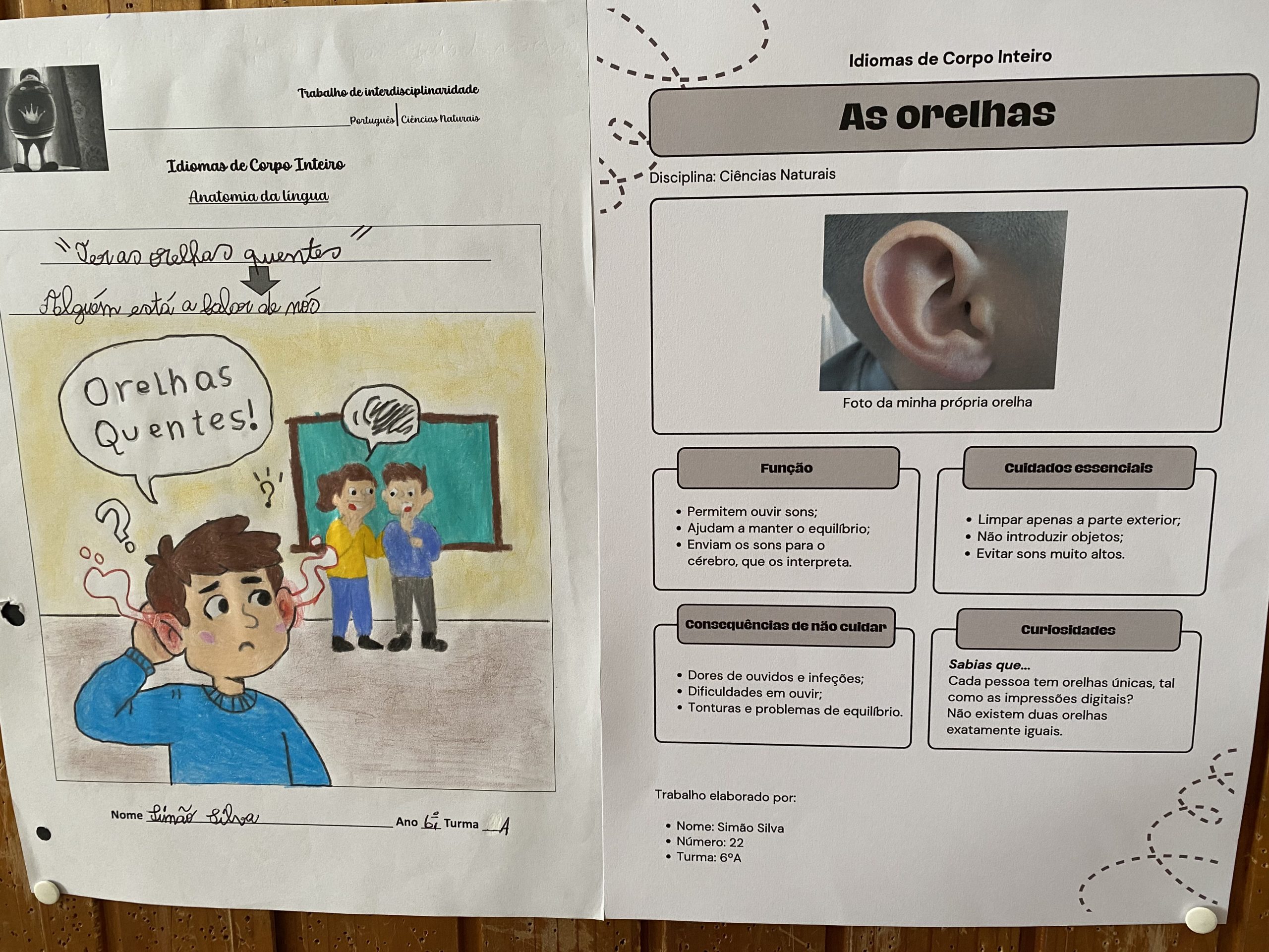 Em paralelo, na disciplina de ciências naturais, cada aluno trabalhou o órgão do corpo humano mencionado na expressão idiomática atribuída, explorando as suas características e funções.