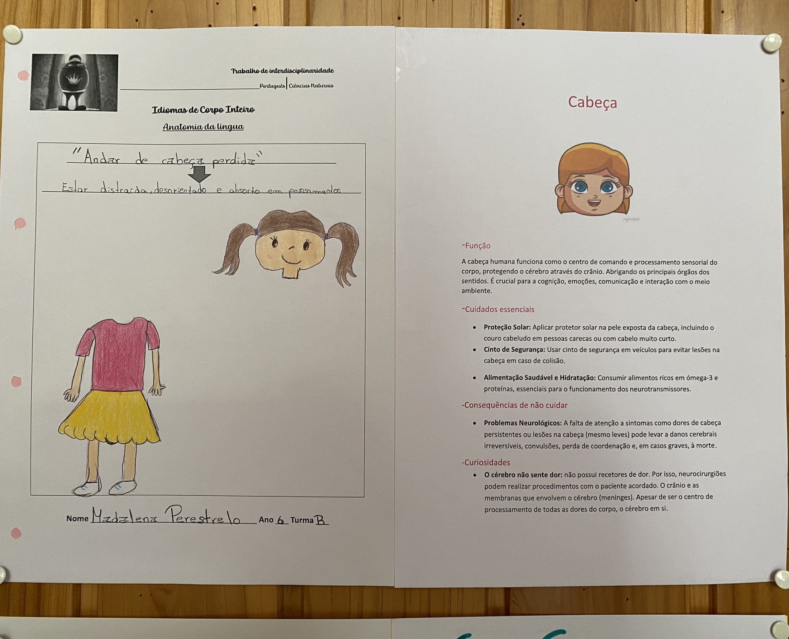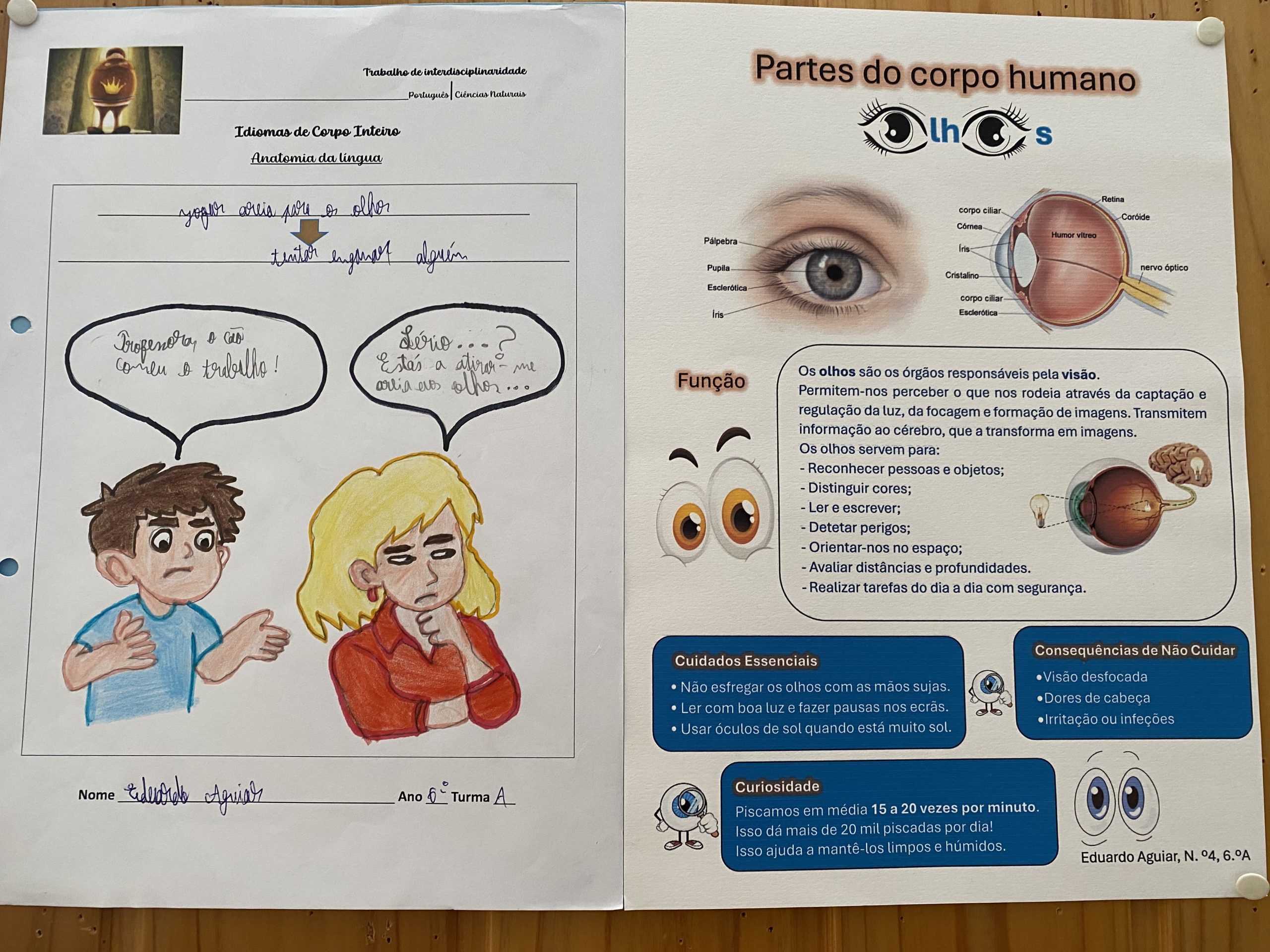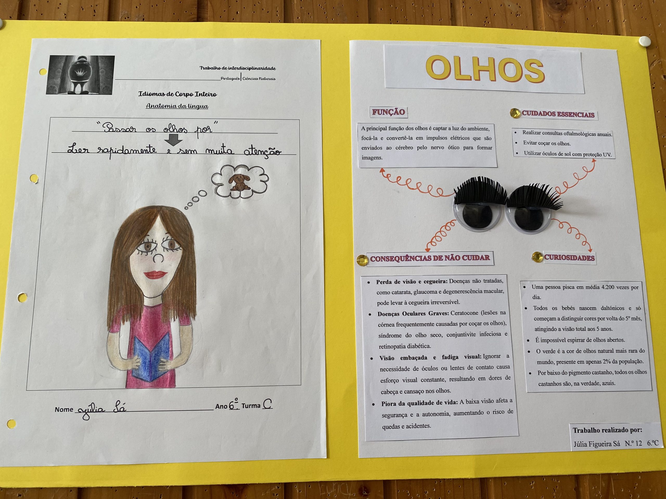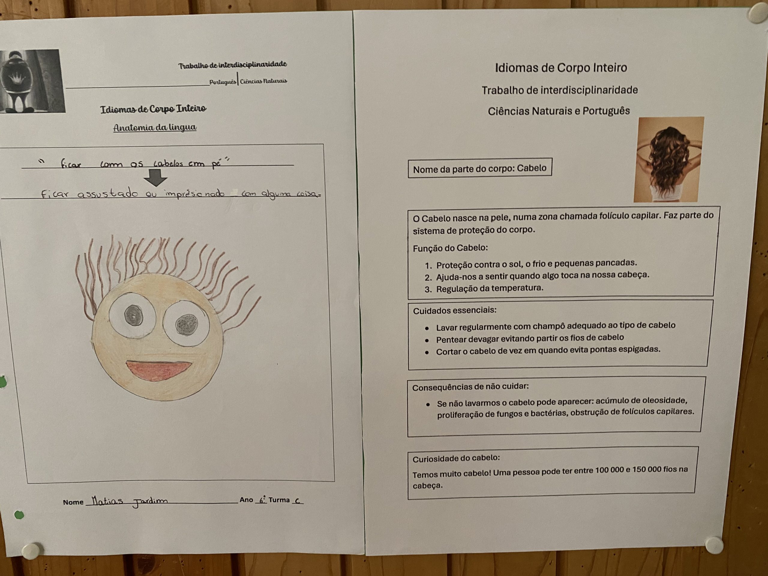 Em paralelo, na disciplina de ciências naturais, cada aluno trabalhou o órgão do corpo humano mencionado na expressão idiomática atribuída, explorando as suas características e funções.