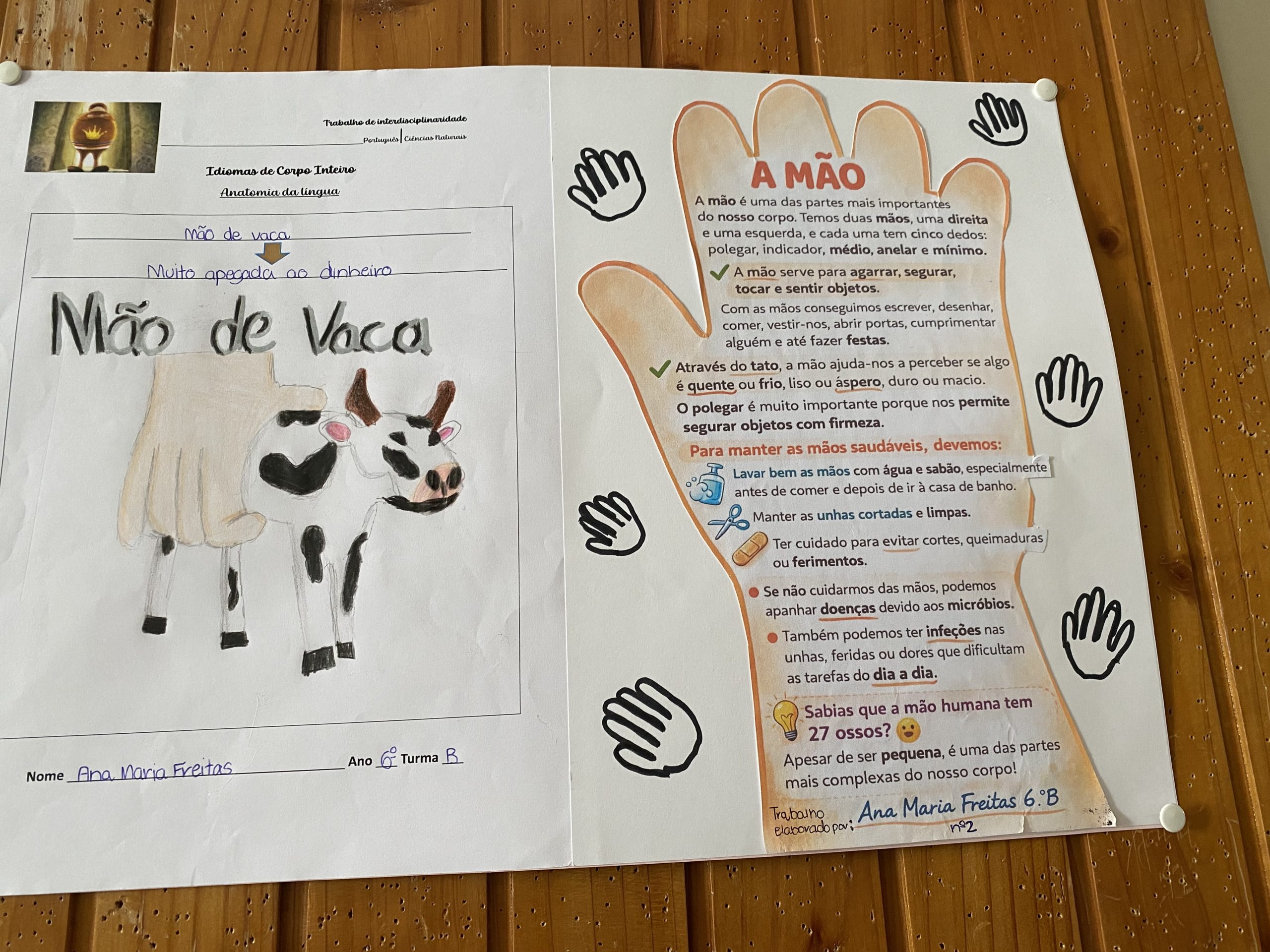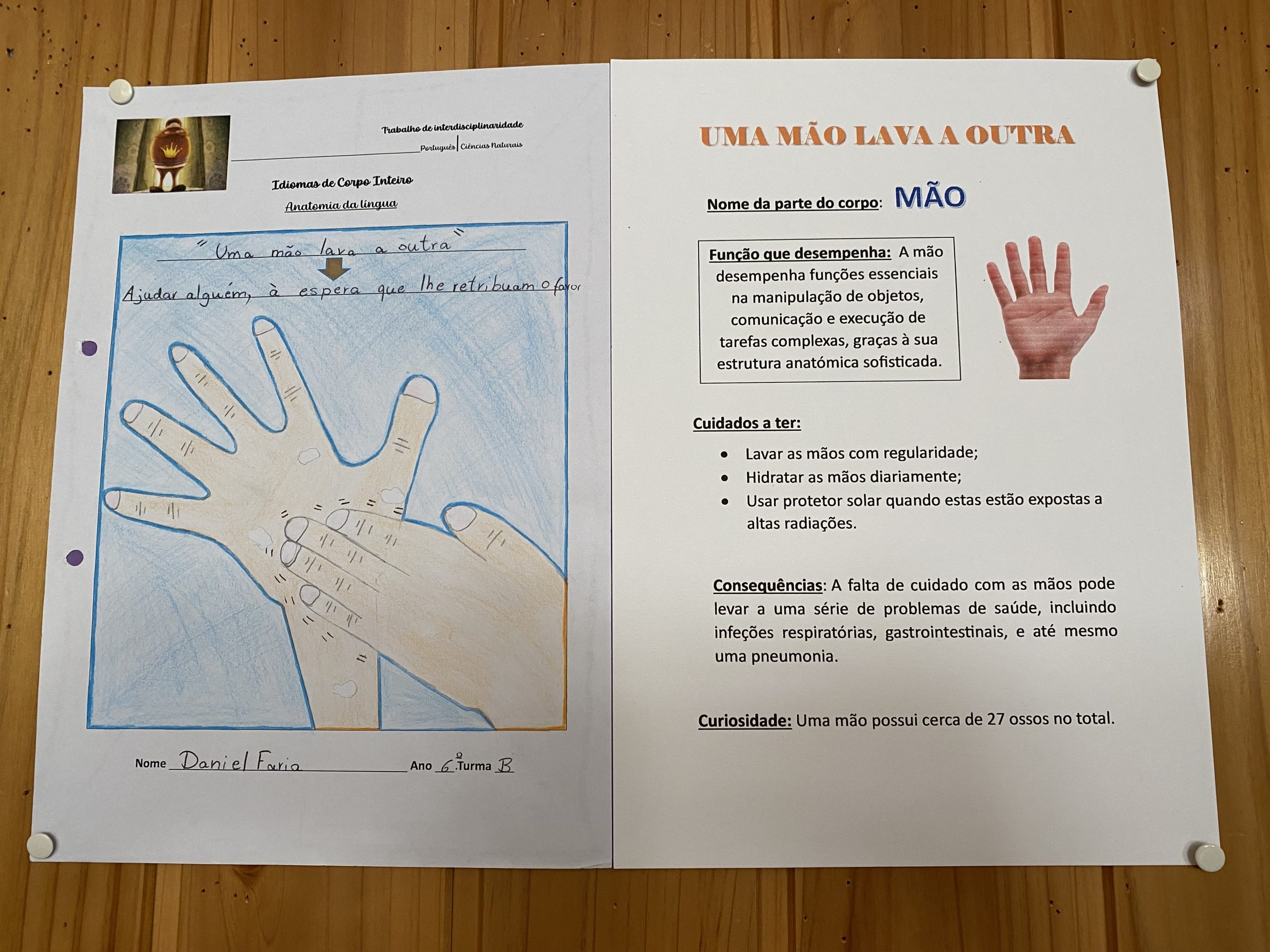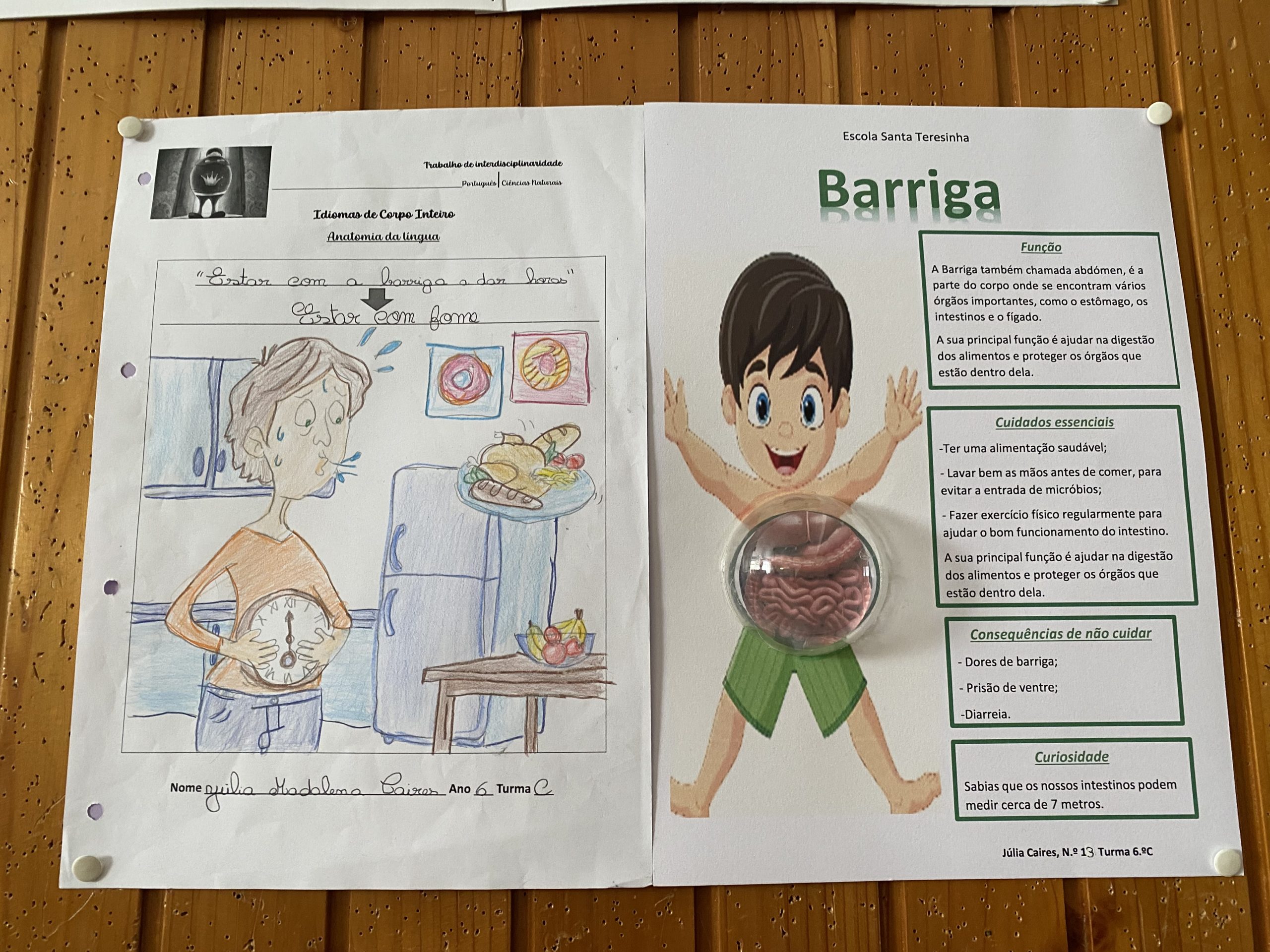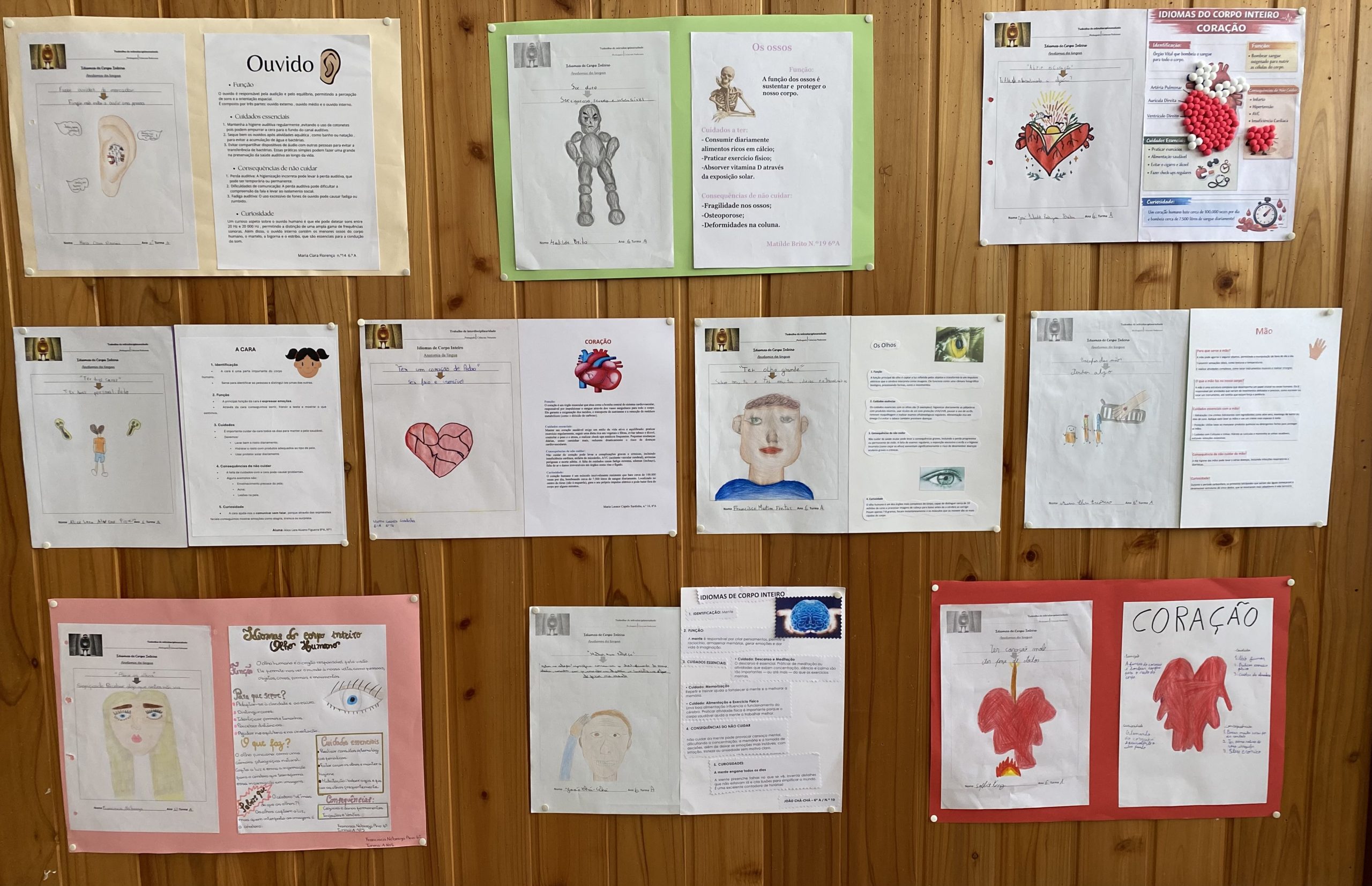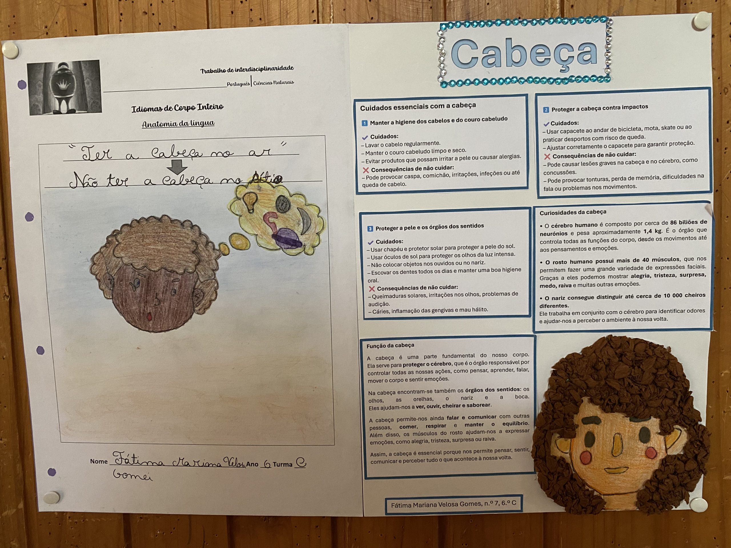Em paralelo, na disciplina de ciências naturais, cada aluno trabalhou o órgão do corpo humano mencionado na expressão idiomática atribuída, explorando as suas características e funções.