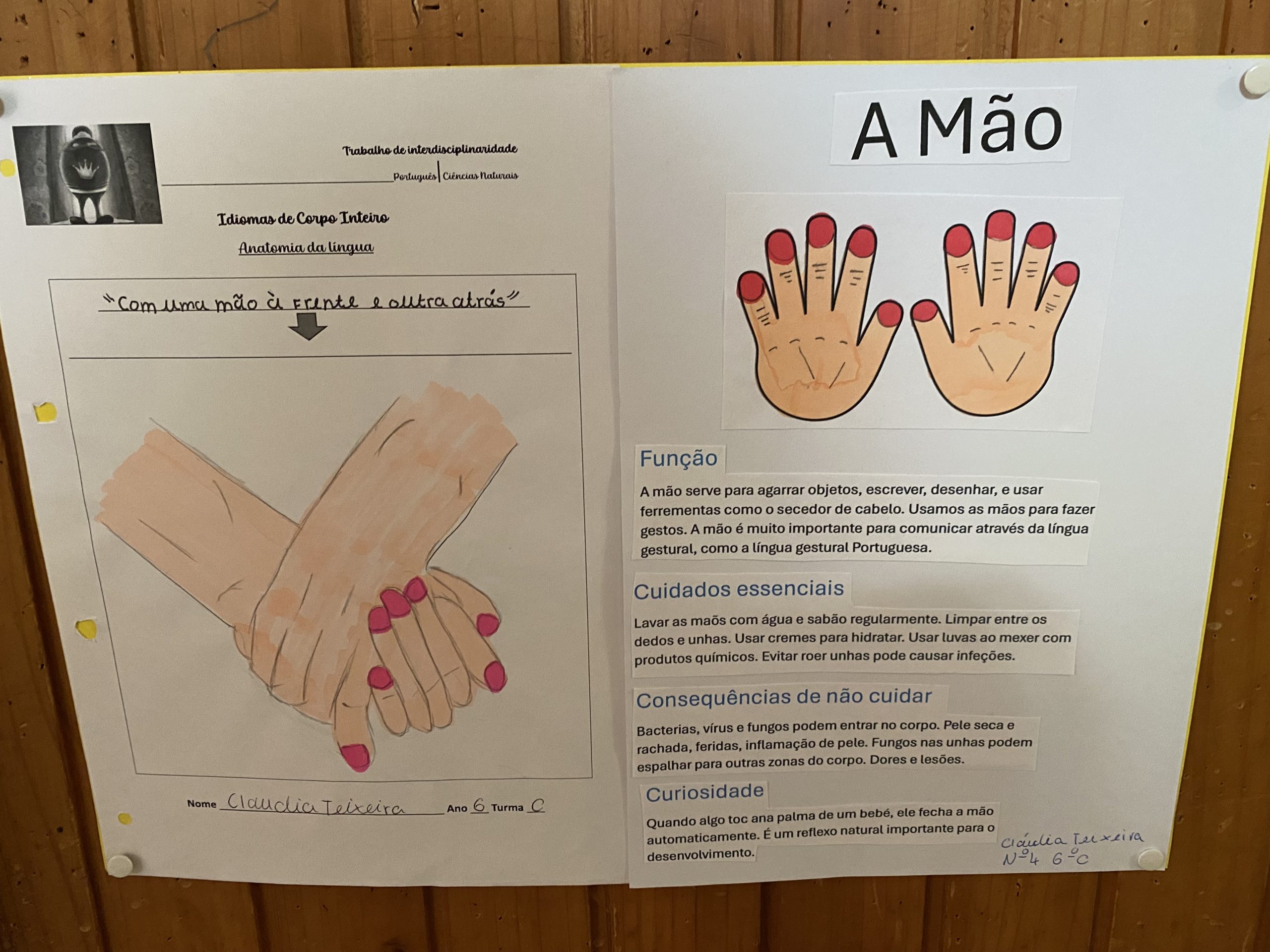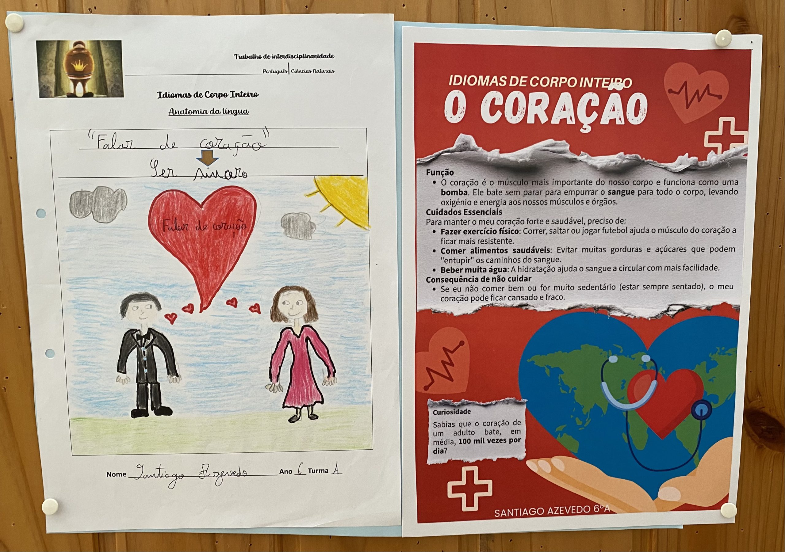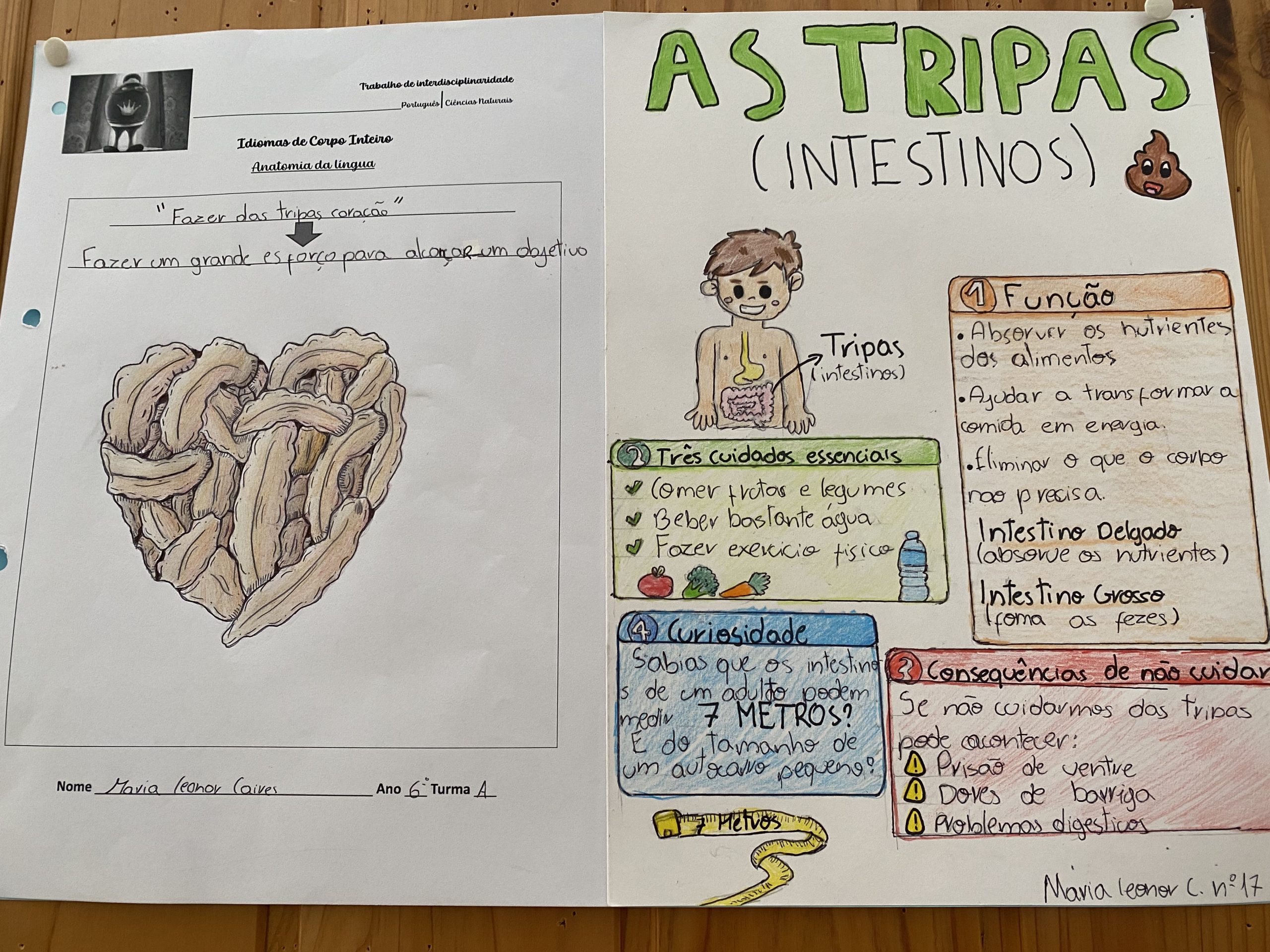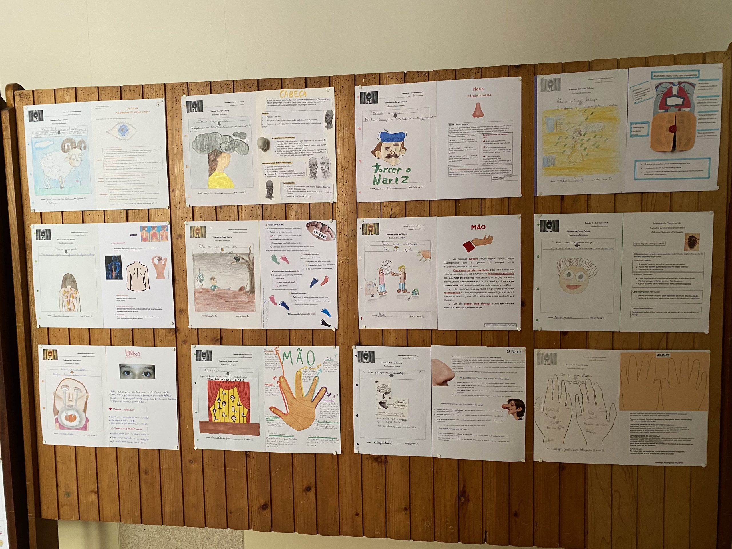 Em paralelo, na disciplina de ciências naturais, cada aluno trabalhou o órgão do corpo humano mencionado na expressão idiomática atribuída, explorando as suas características e funções.