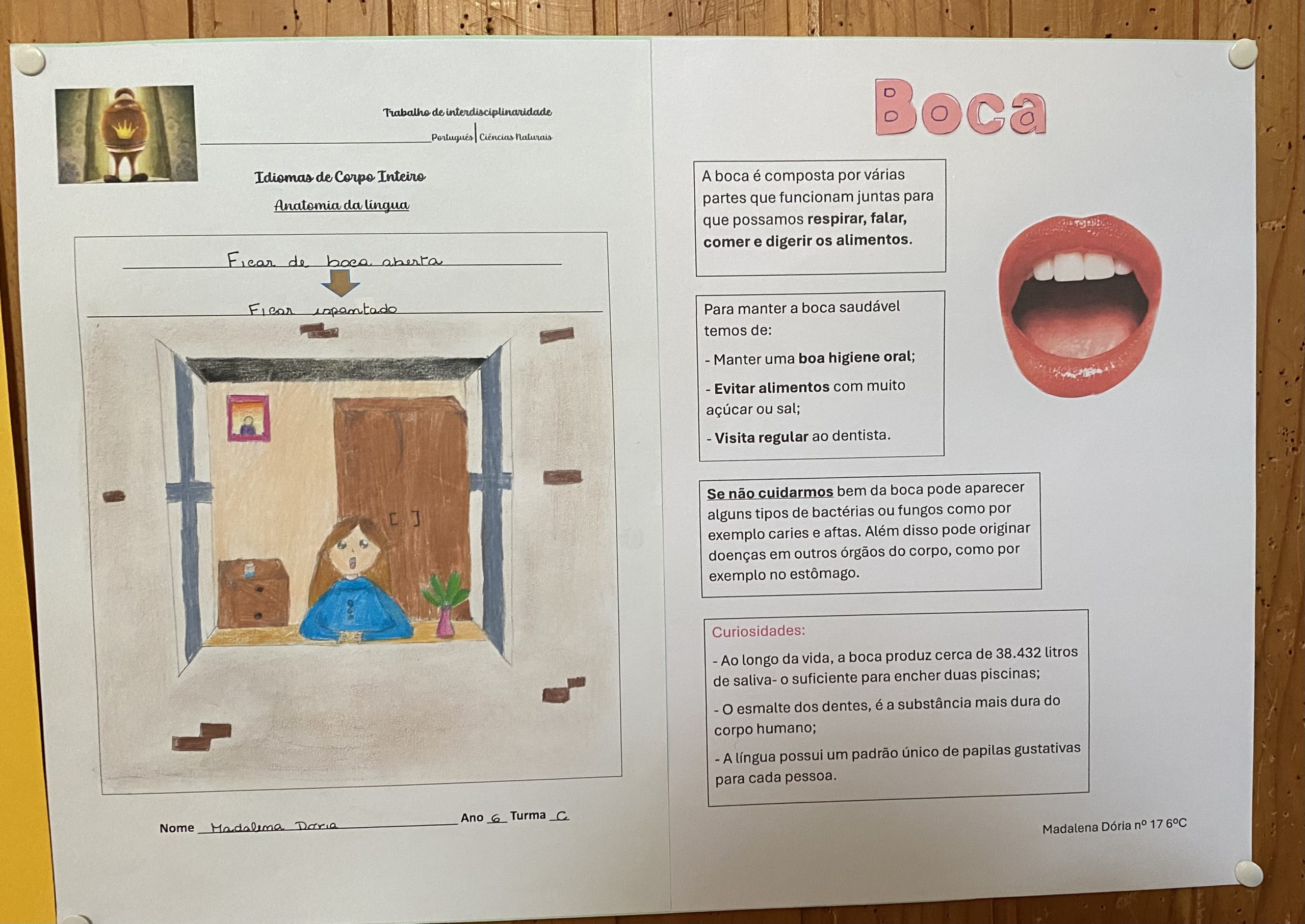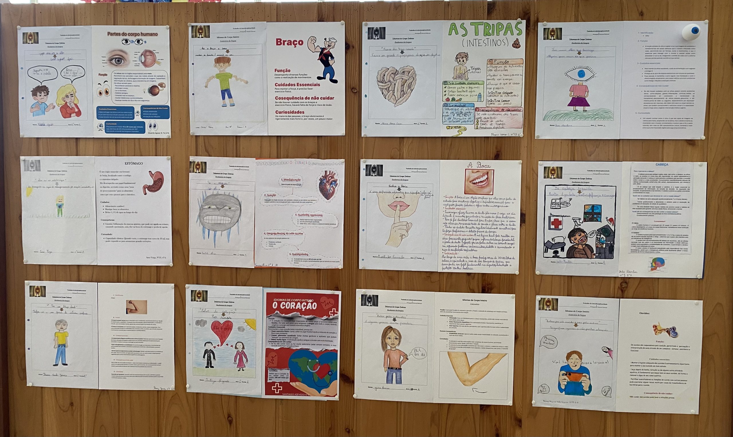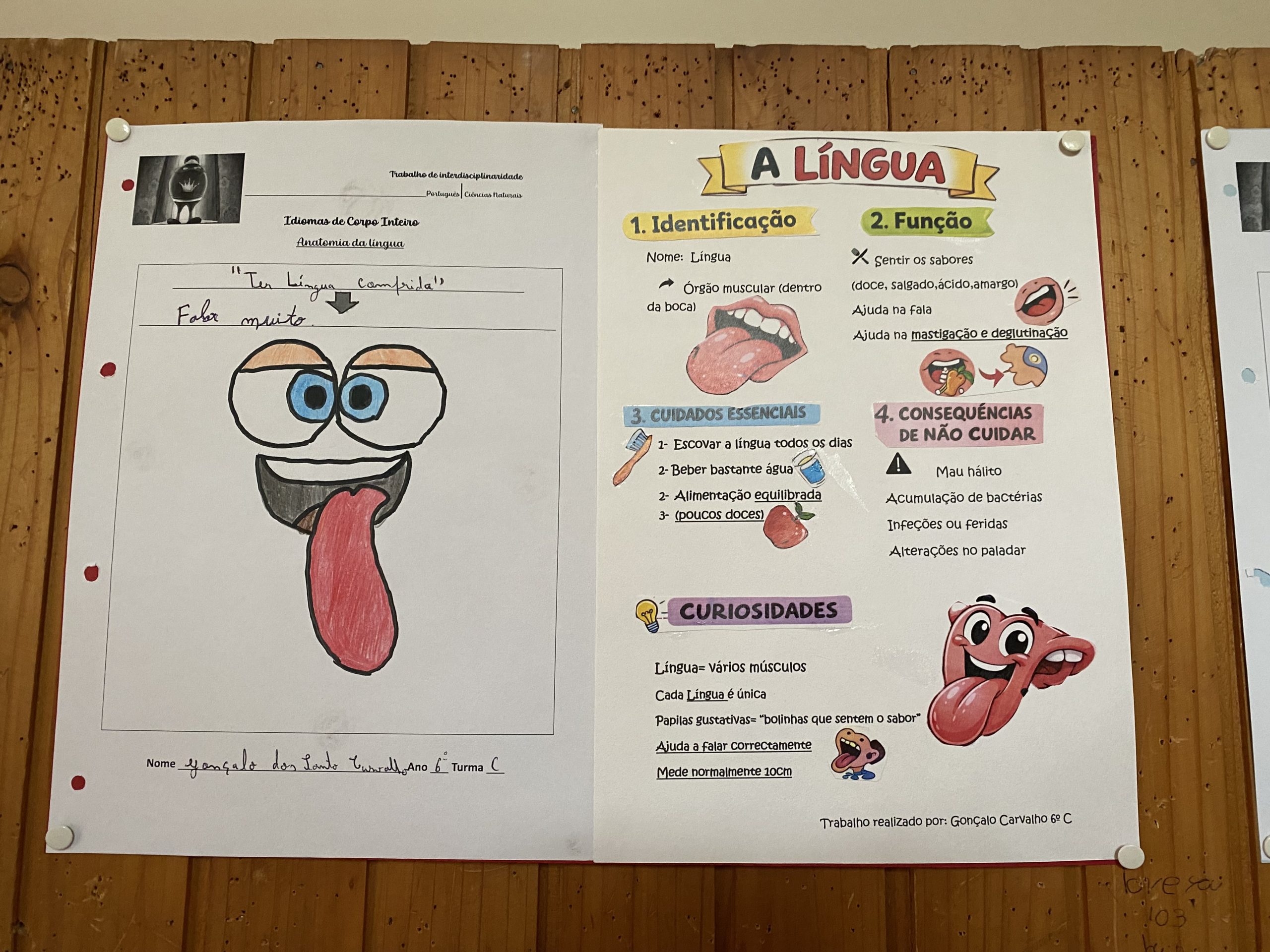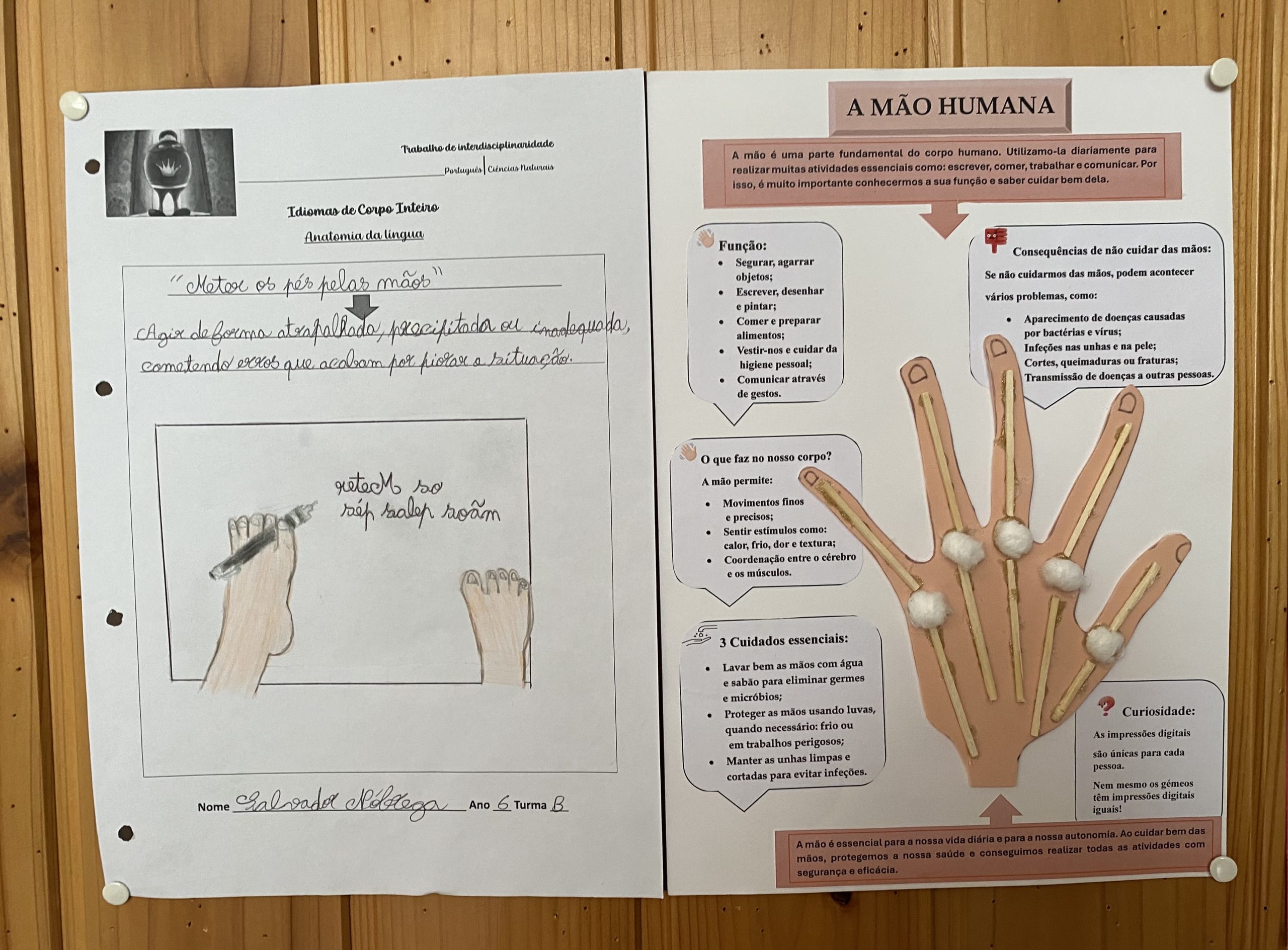 Em paralelo, na disciplina de ciências naturais, cada aluno trabalhou o órgão do corpo humano mencionado na expressão idiomática atribuída, explorando as suas características e funções.