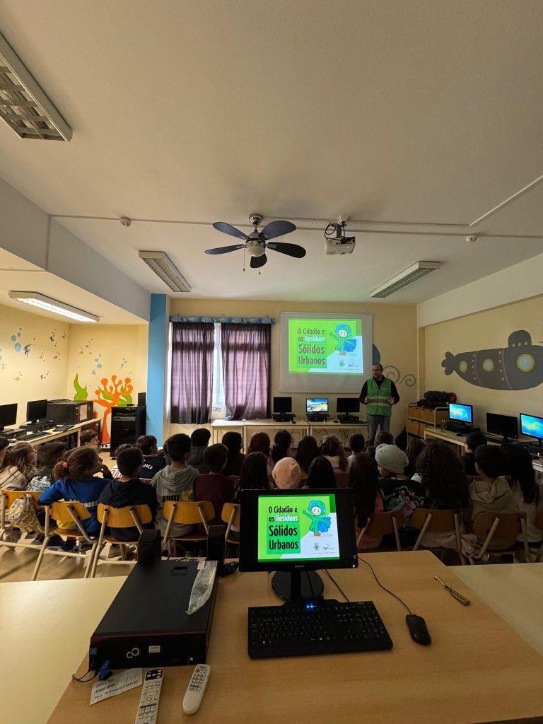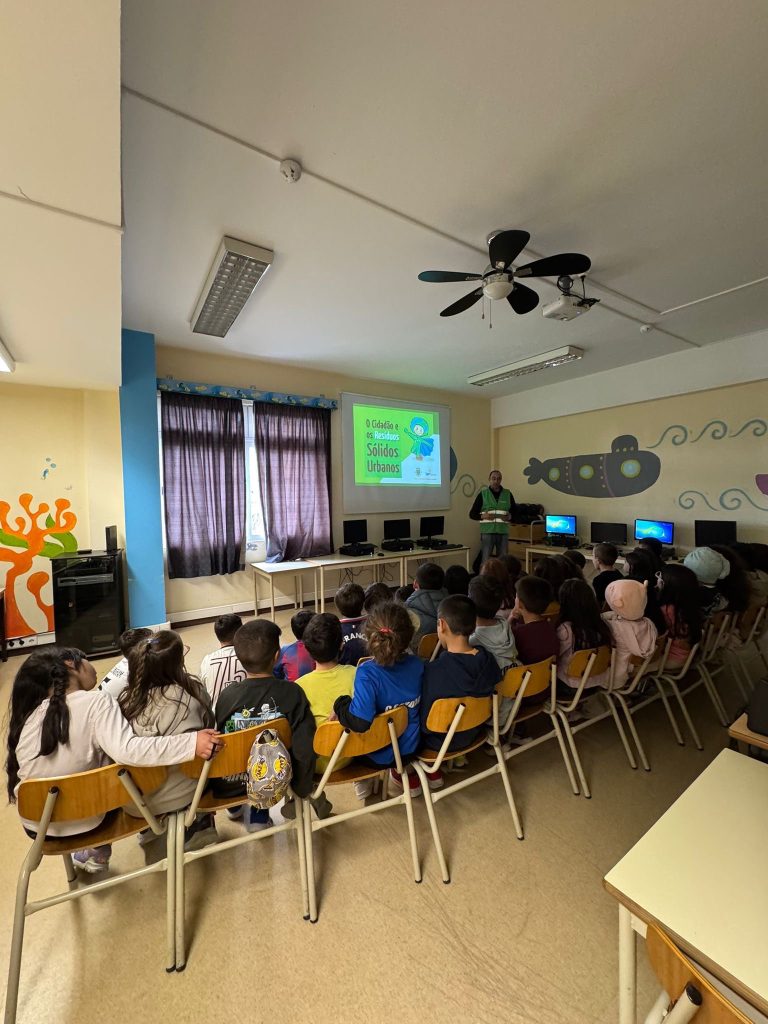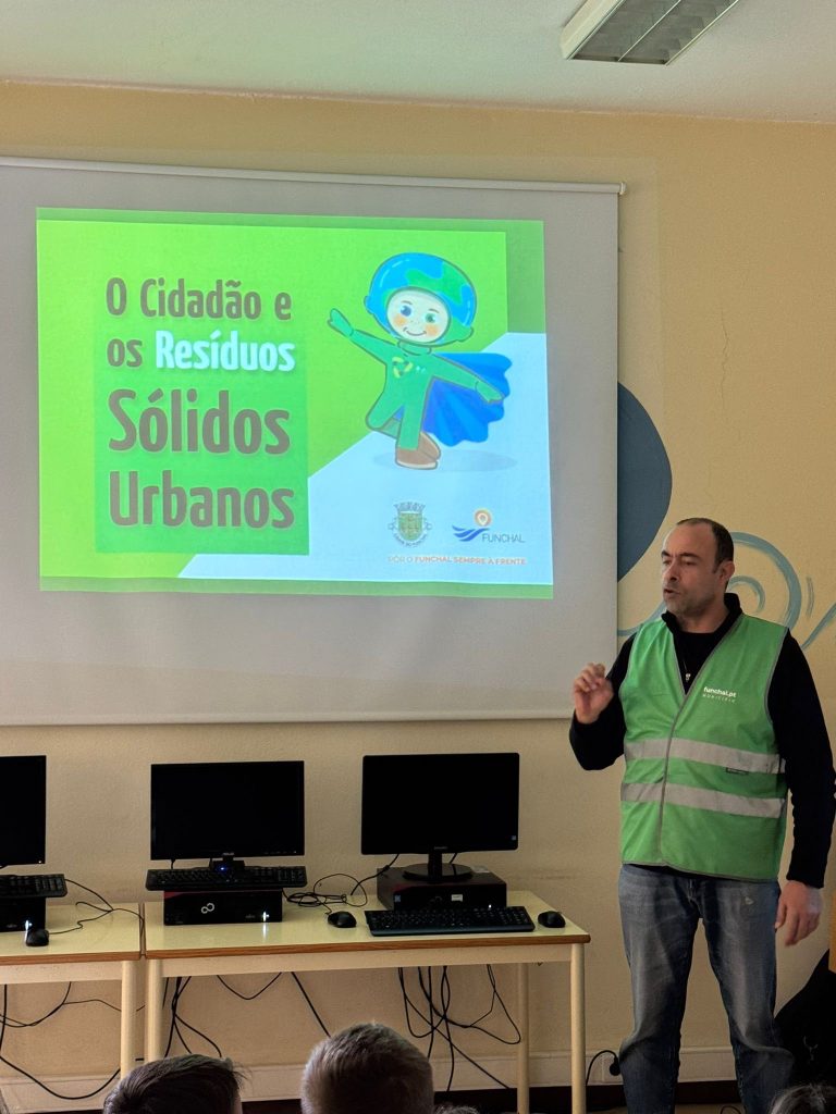 A nossa escola recebeu a visita de um colaborador da Câmara Municipal do Funchal, parceiro do Programa Eco‑Escolas, para dinamizar uma sessão de sensibilização dedicada ao tema dos Resíduos Sólidos Urbanos. A iniciativa, intitulada “O Cidadão e os Resíduos Sólidos Urbanos”, envolveu várias turmas e teve como principal objetivo reforçar a importância de comportamentos responsáveis no que diz respeito à gestão dos resíduos.