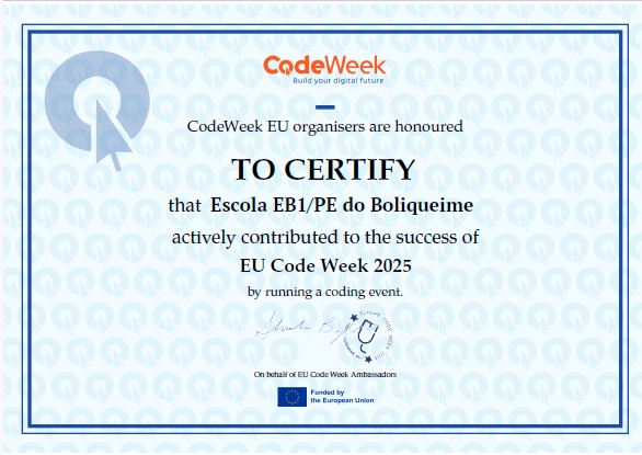 É com enorme prazer que partilhamos que a nossa escola recebeu o Certificado de Participação da UE Code Week 2025.