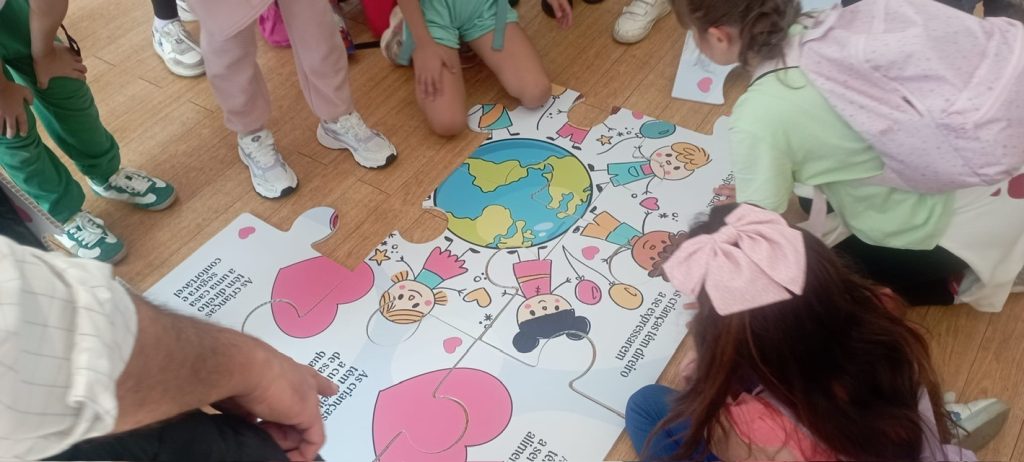 Com as peças recebidas, os alunos construíram o puzzle “Os Direitos das Crianças” no Centro Cultural John dos Passos.