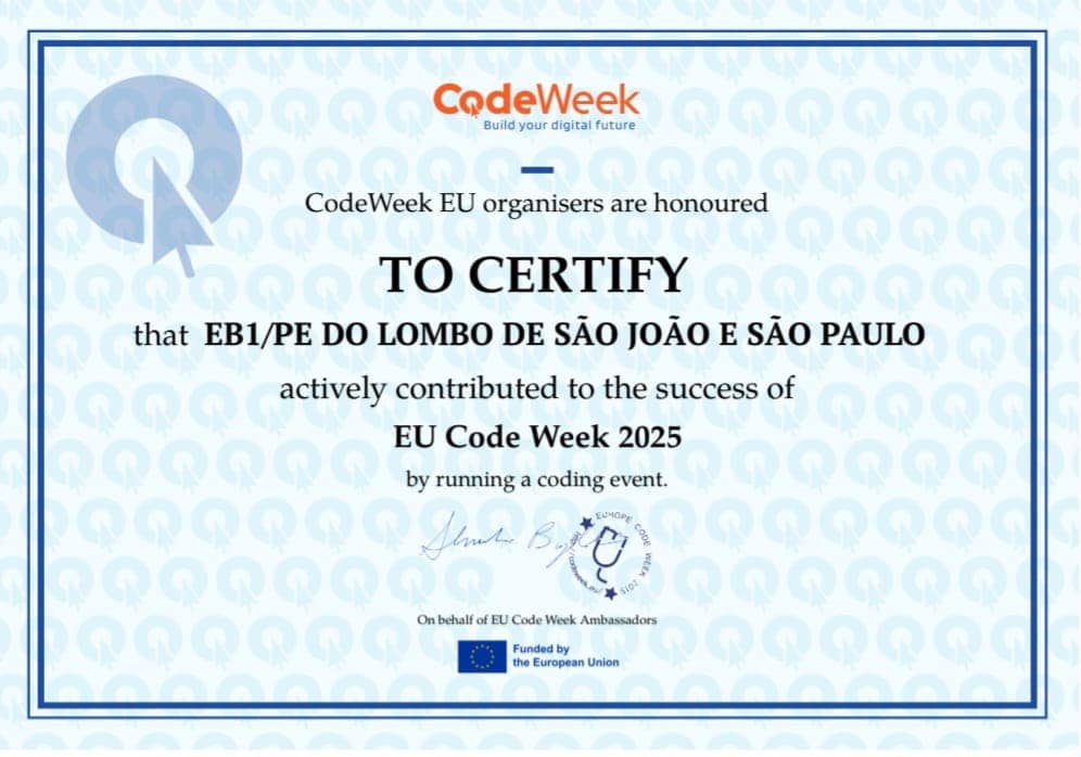 E para coroar esta semana de aprendizagens e de inovação, partilhamos com orgulho o nosso Certificado de Participação da EU Code Week 2025!