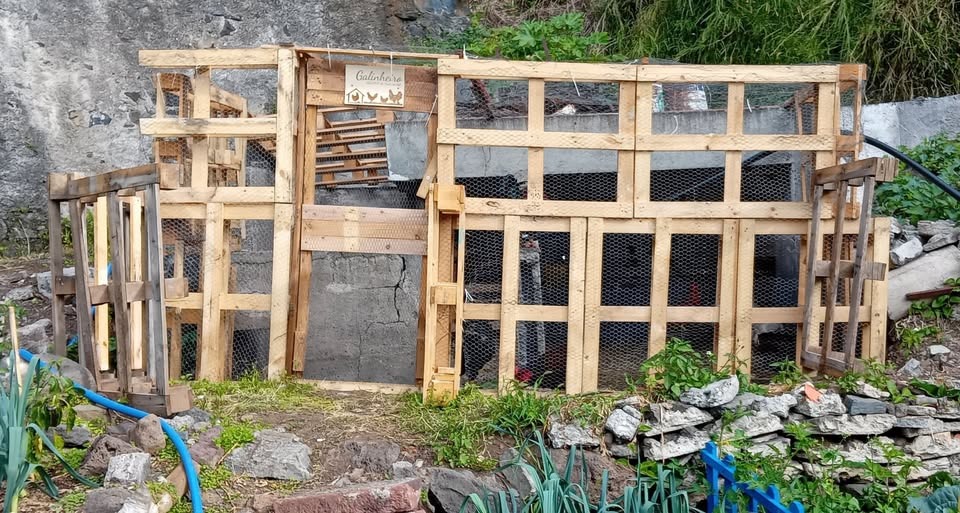 Aqui está a nova casa das galinhas, no edifício “Sede”. Depois de limparmos as antigas pocilgas, transferimos as galinhas para este novo espaço que está junto à nossa horta biológica.