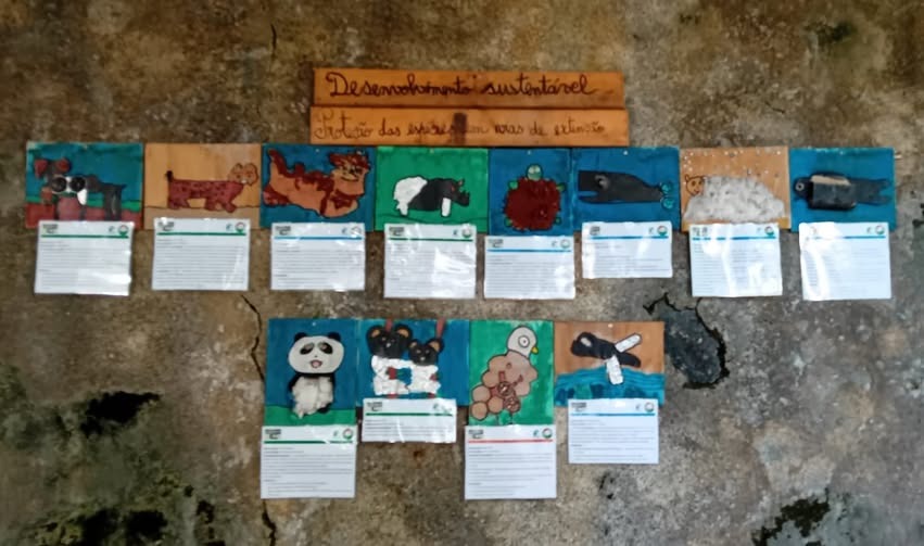 Cada obra representa um animal ameaçado, utilizando técnicas variadas como pintura, colagem e recorte. A diversidade de materiais e estilos evidencia a liberdade criativa dada aos alunos e demonstra o envolvimento ativo das crianças no processo de aprendizagem.