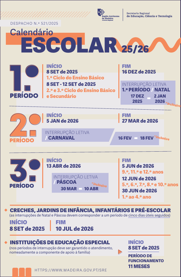 O Calendário Escolar para a Região Autónoma da Madeira 2025/2026 estabelece as datas de início e fim das actividades lectivas, pausas letivas e períodos de avaliação. Este calendário visa organizar o ano escolar de forma equilibrada, garantindo o bom funcionamento das escolas e o sucesso educativo dos alunos. Mantém-se o compromisso com uma gestão eficiente do tempo escolar, promovendo a qualidade das aprendizagens e o bem-estar de toda a comunidade educativa.