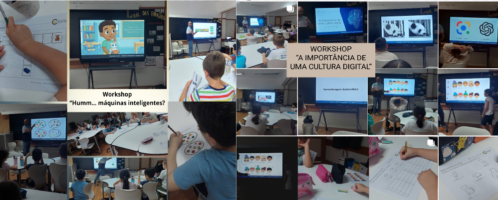 Os workshops foram direcionados a diferentes faixas etárias: – “Humm… máquinas inteligentes?” — para as crianças do Pré-Escolar dos 5 anos e para os alunos do 1.º ano, que exploraram de forma lúdica como as máquinas podem “pensar” e aprender e “A importância de uma cultura digital” para os alunos do 3.º e 4.º anos, que tiveram a oportunidade de criar e experimentar conceitos básicos da programação e da lógica computacional.