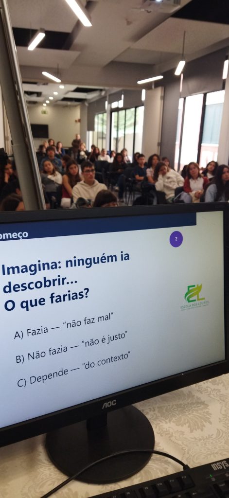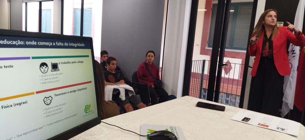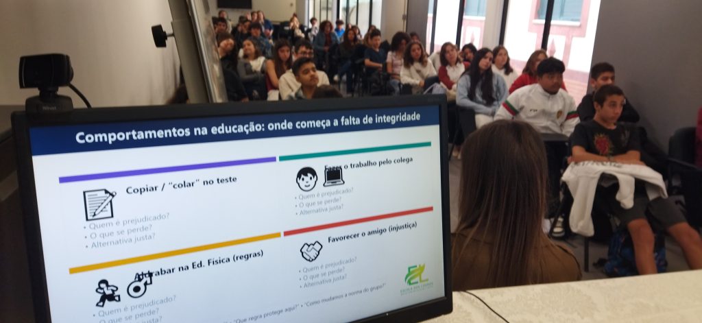 Os alunos refletiram sobre situações do quotidiano escolar como copiar em testes, plágio (incluindo o uso indevido de inteligência artificial), falsificação de justificações ou favoritismo, alertando-se para a normalização destas práticas e para o desgaste da confiança no sistema educativo e na coesão social.