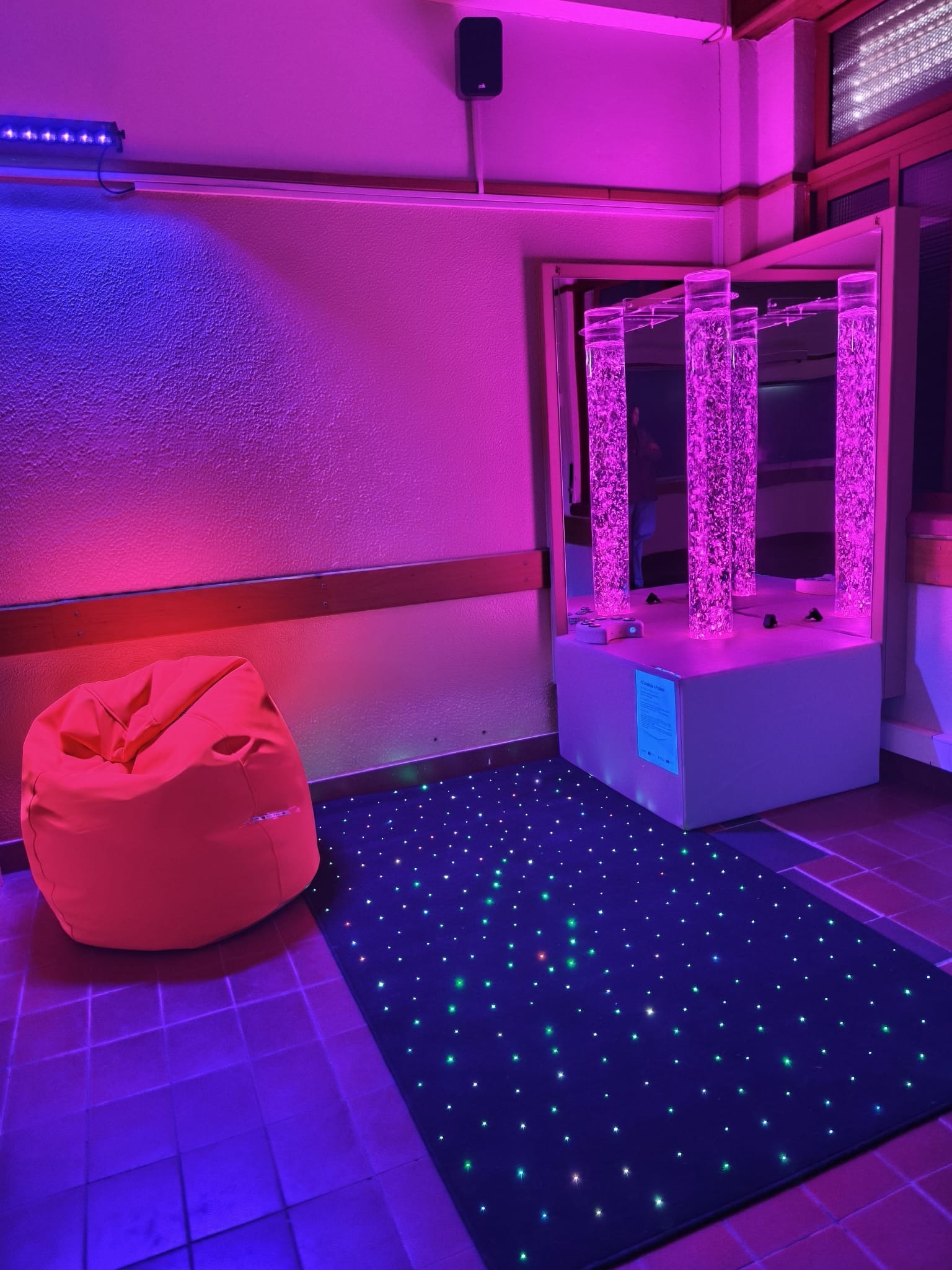 A sala Snoezelen é um ambiente multissensorial concebido para proporcionar um ambiente calmo, seguro e acolhedor, onde os alunos podem explorar estímulos visuais, sonoros, táteis de forma tranquila e controlada.