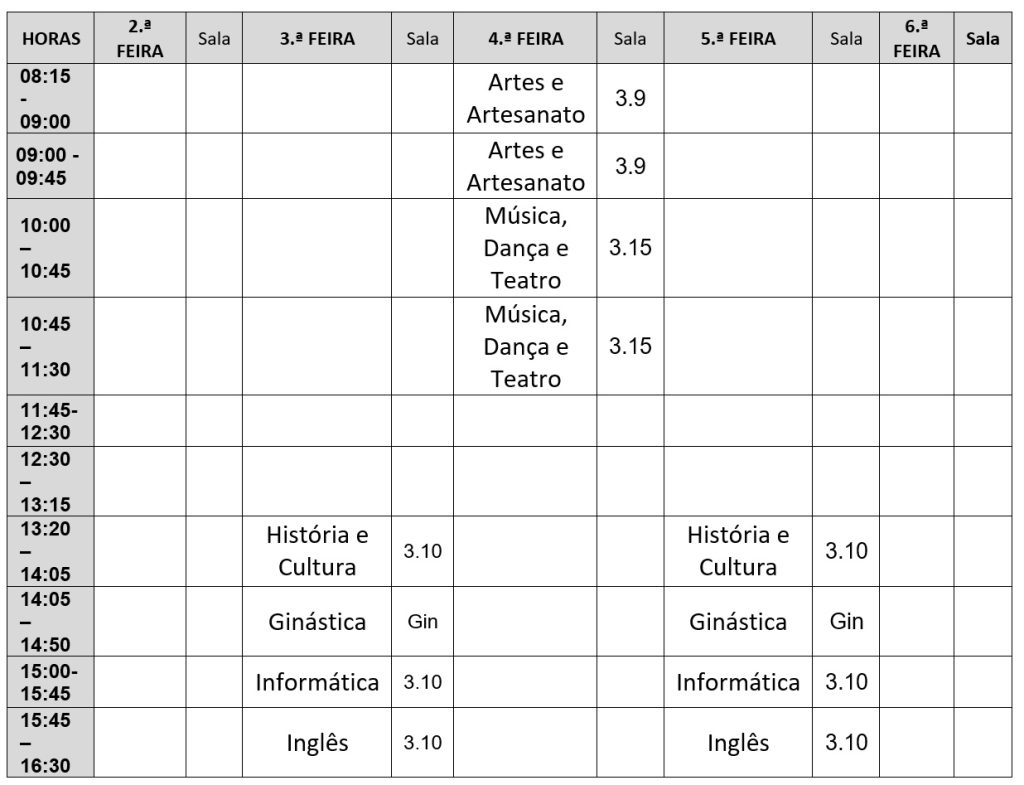 Com uma oferta formativa diversificada, os participantes poderão desenvolver competências em áreas como: História e Cultura locais, Inglês, Informática, Atividade Física, Artes e Artesanato e Música e Teatro. Este projeto pretende, de igual modo, cultivar um verdadeiro espírito de partilha de saberes e convívio entre os participantes, promovendo o envelhecimento ativo e o bem-estar social.