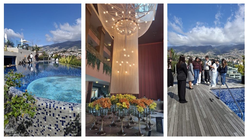 No dia 26 de março as turmas 12/1, 12/2 e 12/3, acompanhados pelas docentes Cecília Campos, Nídia Sousa e António Mendes tiveram a oportunidade de visitar o Hotel Savoy Palace, sendo uma das principais unidades hoteleiras de luxo da nossa ilha, funcionando como um embaixador moderno da hospitalidade da ilha. O hotel é reconhecido internacionalmente, assumindo-se como o melhor hotel de luxo da Europa em 2025 e destaca-se pela fusão entre a herança histórica do antigo Hotel Savoy (fundado em 1912) e um design contemporâneo de vanguarda. O hotel incorpora elementos culturais locais e a decoração inspira-se no bordado da Madeira, no vime e na floresta Laurissilva, transformando a estadia numa experiência única e diferenciada. Atrai também um segmento importante de turismo de negócios e eventos internacionais, possuindo salas multifuncionais de última geração. Os alunos puderam, assim, vivenciar uma experiência única, já que o Hotel Savoy Palace é mais do que um hotel pois funciona como um motor estratégico para a economia regional e a imagem global da Madeira. Atrai milhares de turistas anualmente, promovendo a imagem da Madeira internacionalmente. Estudos indicam que a notoriedade do hotel tem um impacto positivo direto no turismo da região, já que incentiva o consumo em restaurantes e cafés circundantes, promove a gastronomia regional e atrai eventos internacionais, gerando direta ou indiretamente inúmeros postos de trabalho. Para os alunos da nossa escola esta visita revelou-se uma experiência única e inspiradora, focada numa oferta inspirada na valorização da cultura regional. Agradecemos a calorosa receção do staff do hotel que nos acompanhou e nos guiou durante toda a visita!