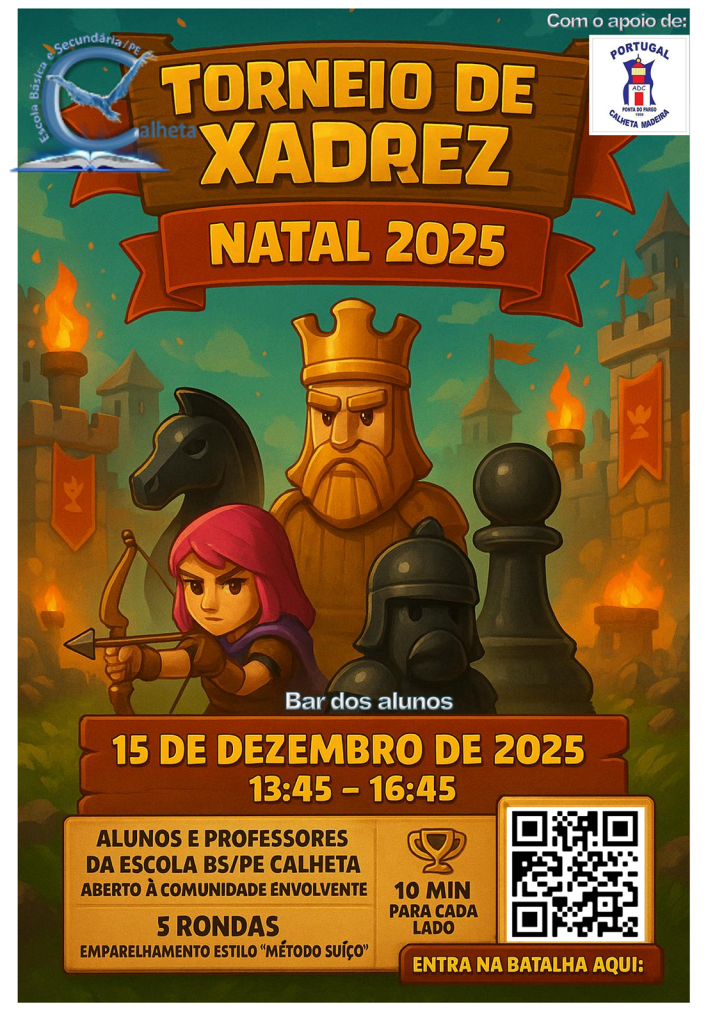 TORNEIO DE XADREZ – NATAL 2025 Clube de xadrez / ebscalheta Está aberta a inscrição para o Torneio de Xadrez de Natal 2025, dirigido a alunos e professores da Escola BS/PE Calheta e aberto à comunidade! Serão 5 rondas, com ritmo de 10 minutos para cada jogador, em emparelhamento estilo “Método Suíço”. Este evento conta com o apoio da ADC da Ponta do Pargo, que se junta a nós para promover o xadrez, a estratégia e o espírito natalício! 🔗 Inscrições (obrigatórias) pelo link ou código QR: https://forms.gle/Yf6YvJqXafwRLDNb6 Participa, aprende e diverte-te com o Xadrez! TORNEIO DE XADREZ – NATAL 2025 Ler Mais »