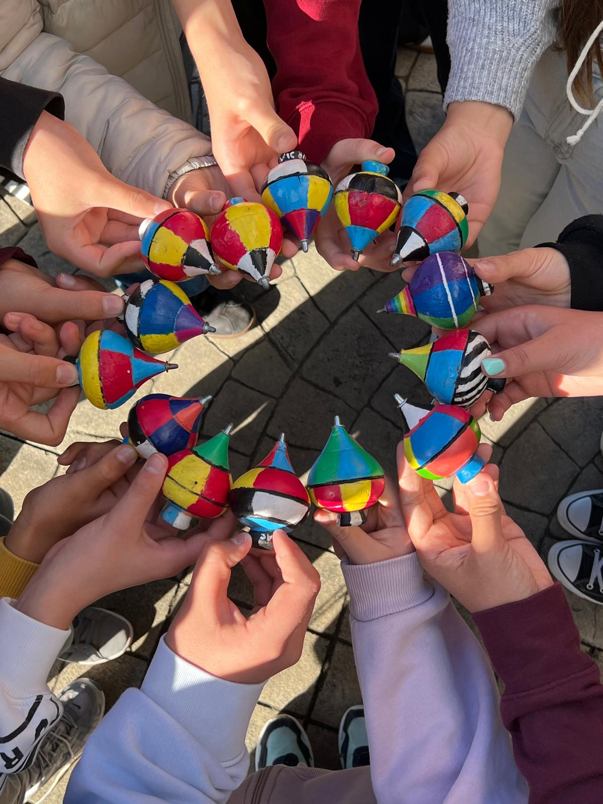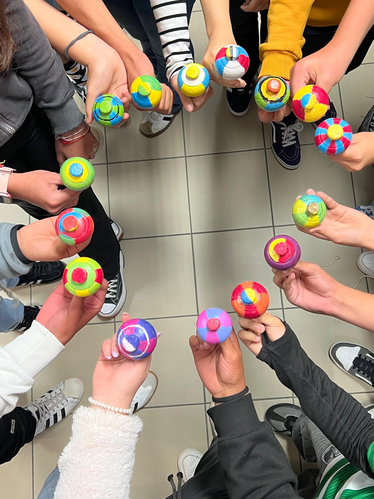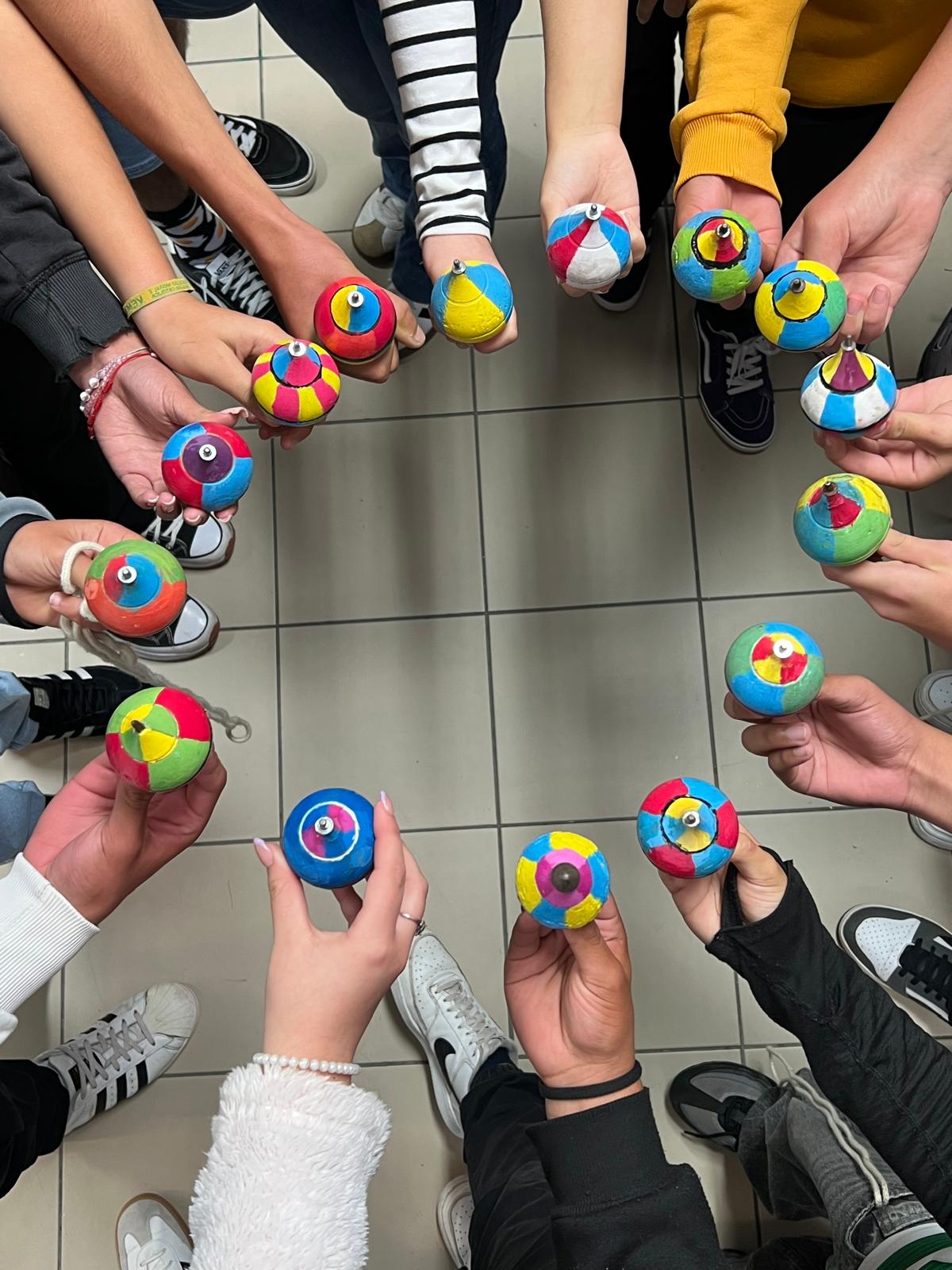A iniciativa integrou igualmente um trabalho articulado com a disciplina de Educação Visual, envolvendo as turmas de 7ºAC, 7ºBC, 8ºAC e 8ºBC. Depois de aprenderem a jogar o pião, cada aluno pintou o seu próprio pião utilizando as cores, explorando o efeito visual criado pelo movimento circular.