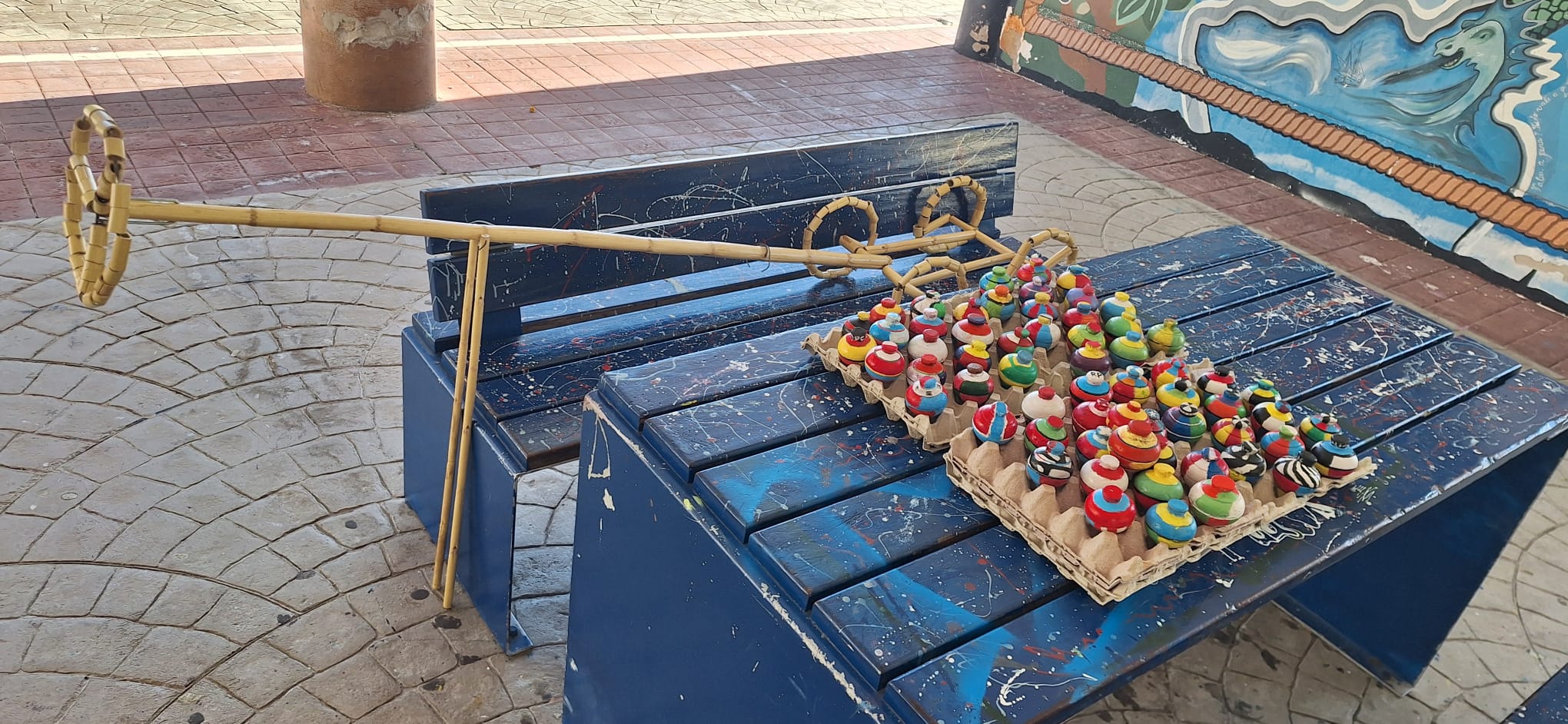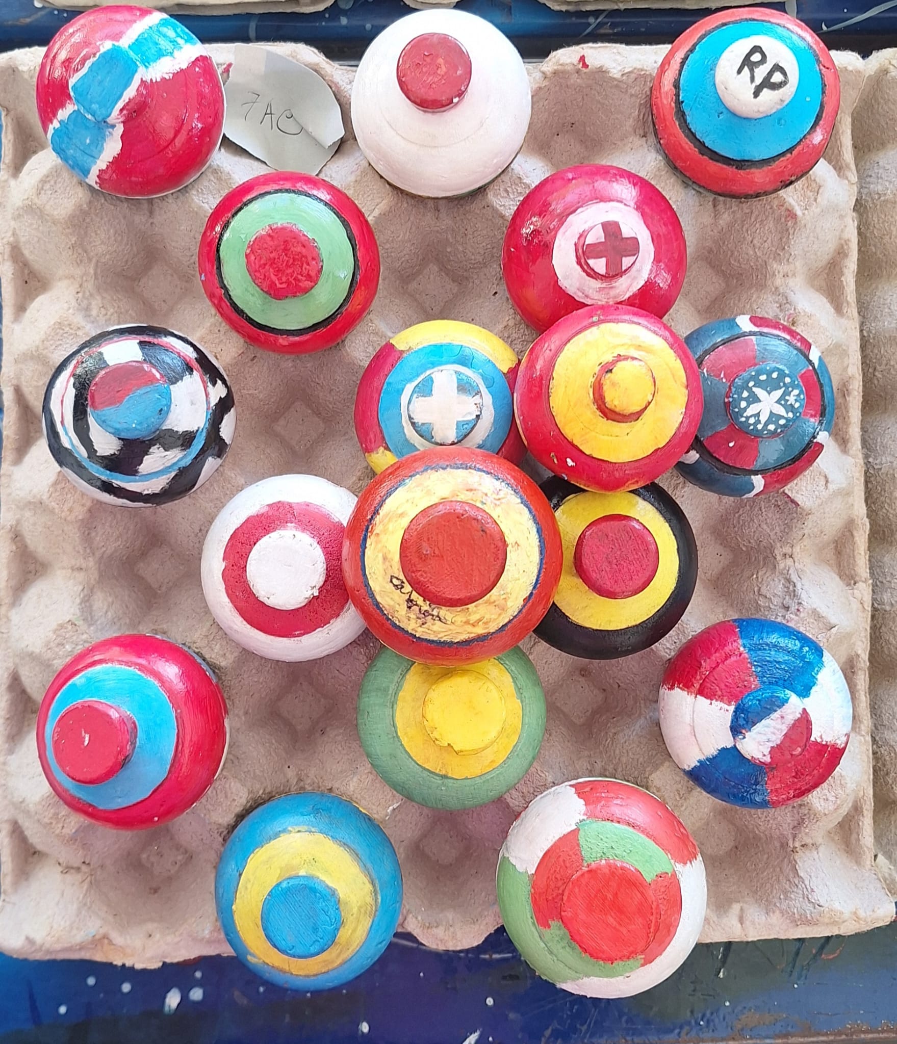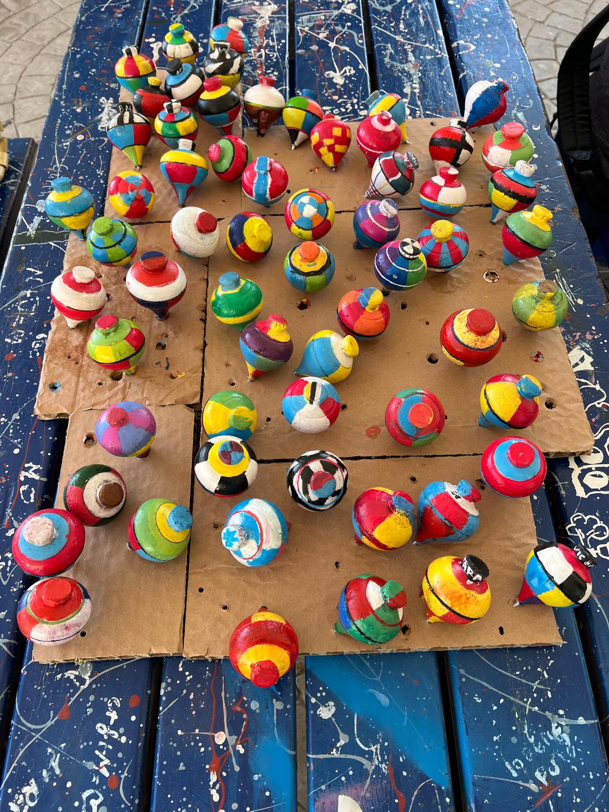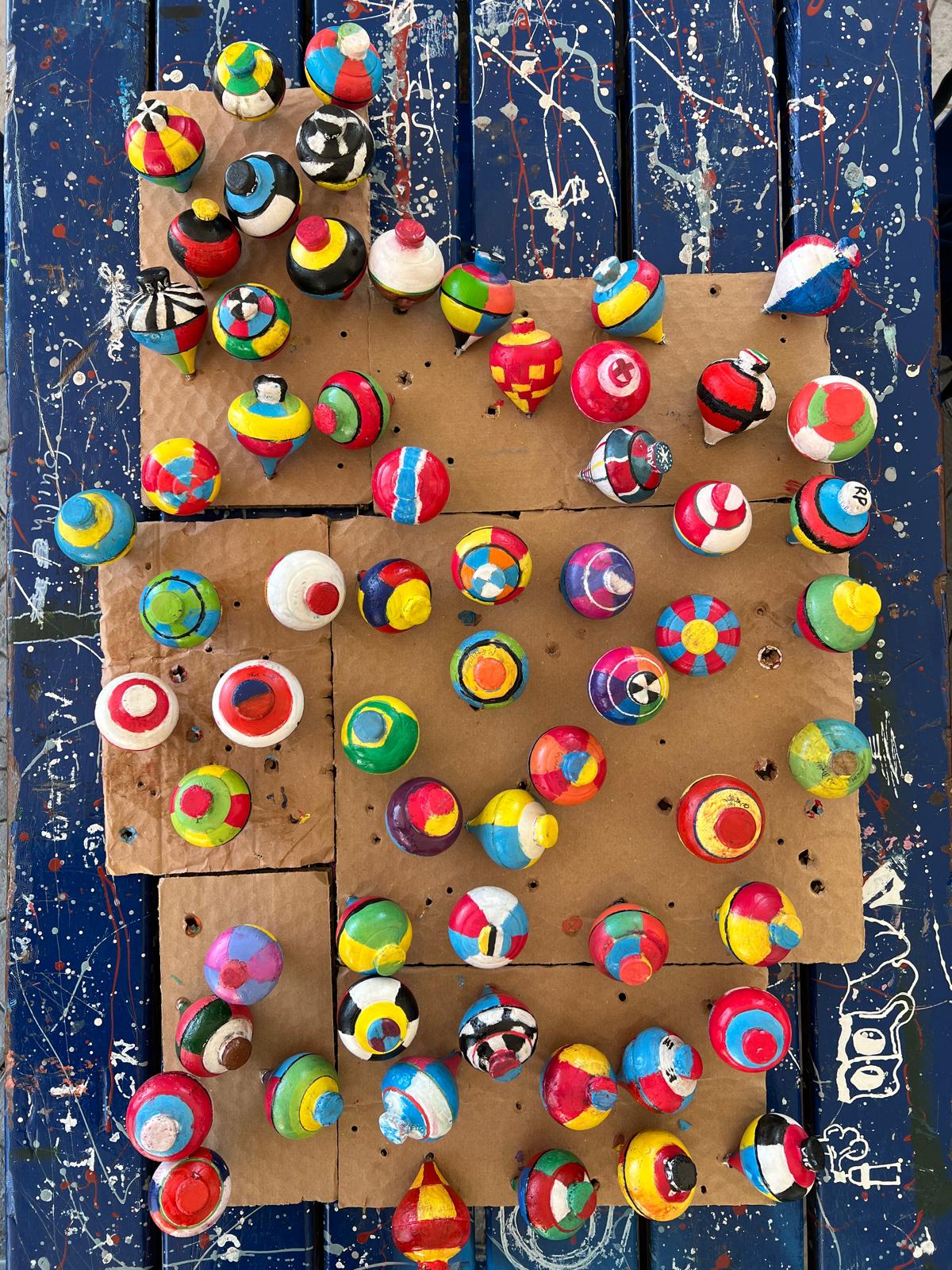 A iniciativa integrou igualmente um trabalho articulado com a disciplina de Educação Visual, envolvendo as turmas de 7ºAC, 7ºBC, 8ºAC e 8ºBC. Depois de aprenderem a jogar o pião, cada aluno pintou o seu próprio pião utilizando as cores, explorando o efeito visual criado pelo movimento circular.