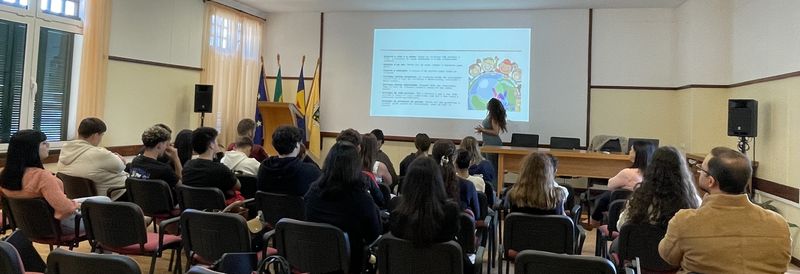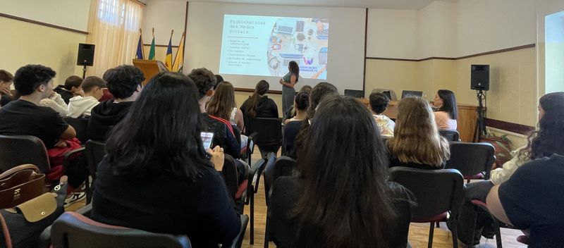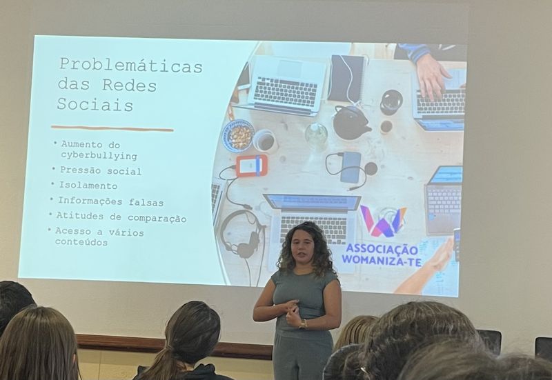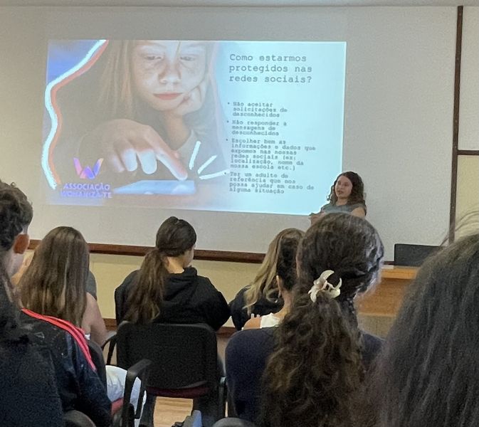 Os alunos do 9.º ano participaram numa ação de sensibilização dinamizada pela associação “Womaniza-te”, no âmbito do Dia Europeu da Proteção das Crianças contra a Exploração e o Abuso Sexual. Durante a sessão foram abordados temas como o respeito pelos limites pessoais, a identificação de situações de risco e os cuidados a ter na utilização da internet, especialmente na partilha de fotografias e no contacto com desconhecidos.