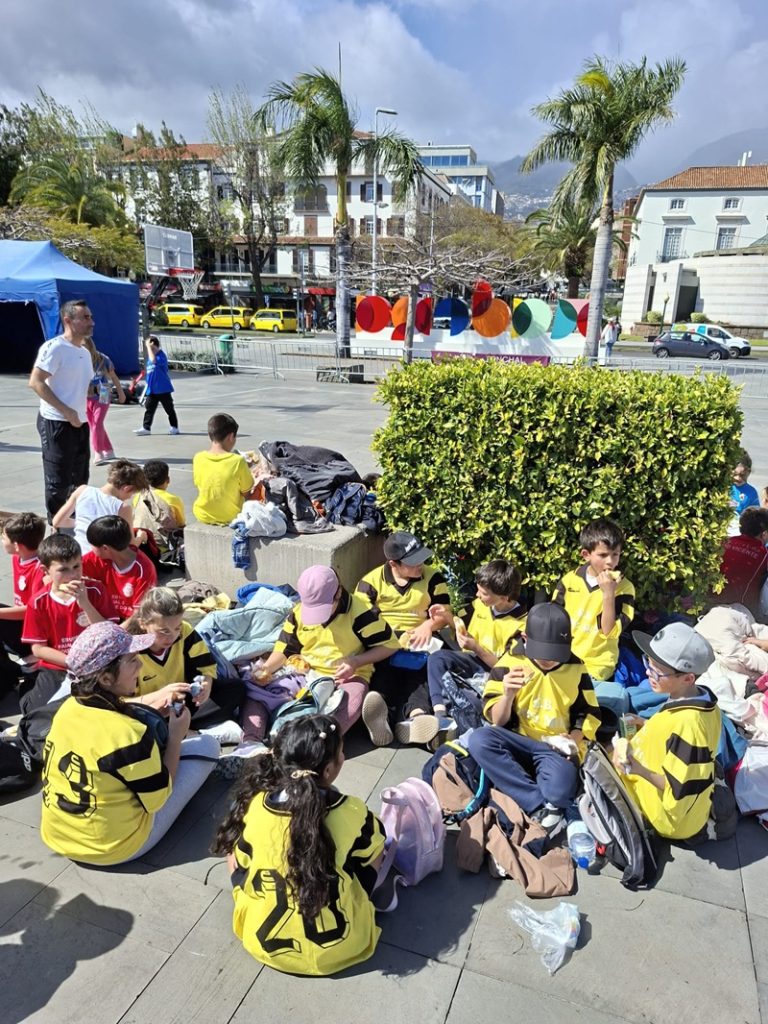 A saída da escola deu-se por volta das doze horas e trinta minutos. À chegada à praça do povo, os