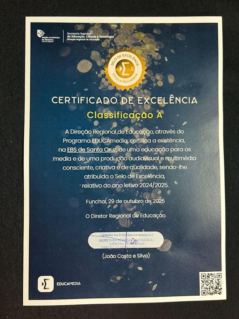 A Escola Básica e Secundária de Santa Cruz recebeu o Certificado de Excelência (Classificação A) atribuído pela Direção Regional de Educação, através do Programa EDUCAmedia.