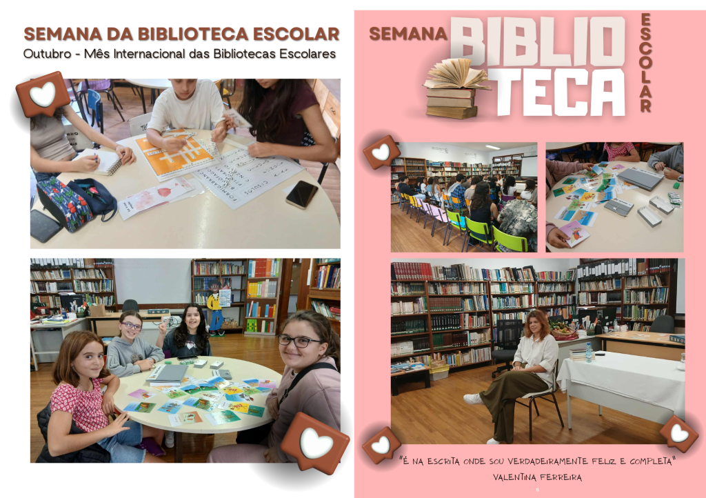 Ao longo da semana, os alunos dos 2.º e 3.º ciclos tiveram a oportunidade de realizar vários jogos da Maleta Pedagógica, intitulada Os Bibliófagos.o dia 30 de outubro tivemos como autora convidada a escritora Valentina Ferreira, que veio falar do seu percurso literário, do seu processo criativo e das suas obras.