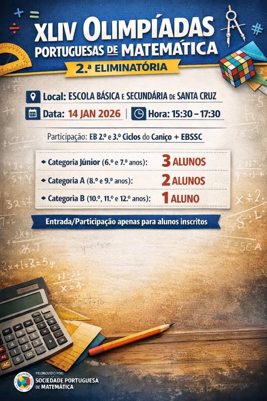 A Escola Básica e Secundária de Santa Cruz foi selecionada como local de realização da 2.ª eliminatória das XLIV Olimpíadas Portuguesas de Matemática, promovidas pela Sociedade Portuguesa de Matemática.