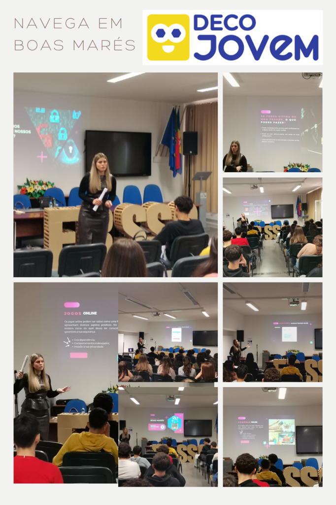 No dia 3 de fevereiro de 2026, decorreu na sala de sessões da nossa escola a palestra “Navega em Boas Mares”, no âmbito do mês de fevereiro, dedicado à Internet Segura. A sessão foi dinamizada pela Dr.ª Alexandra Caldeira, da DECOJovem, e destinou-se aos alunos das turmas 9.º A, B e C.