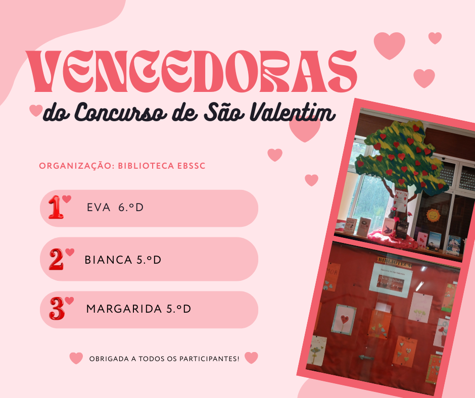 No âmbito do Concurso de São Valentim, organizado pela biblioteca da nossa escola, foram distinguidas três alunas pelo seu talento e criatividade. O primeiro lugar foi atribuído a uma aluna do 6.º D, que se destacou pela originalidade do seu trabalho. O segundo e o terceiro lugares foram conquistados por duas alunas do 5.º D, que também impressionaram o júri com a qualidade das suas participações. Parabéns a todas as vencedoras pelo excelente desempenho! 💖