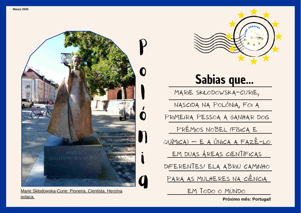 No âmbito das atividades do nosso Clube Europeu, viajámos este mês até à Polónia, um país rico em história, cultura e grandes personalidades que marcaram o mundo.